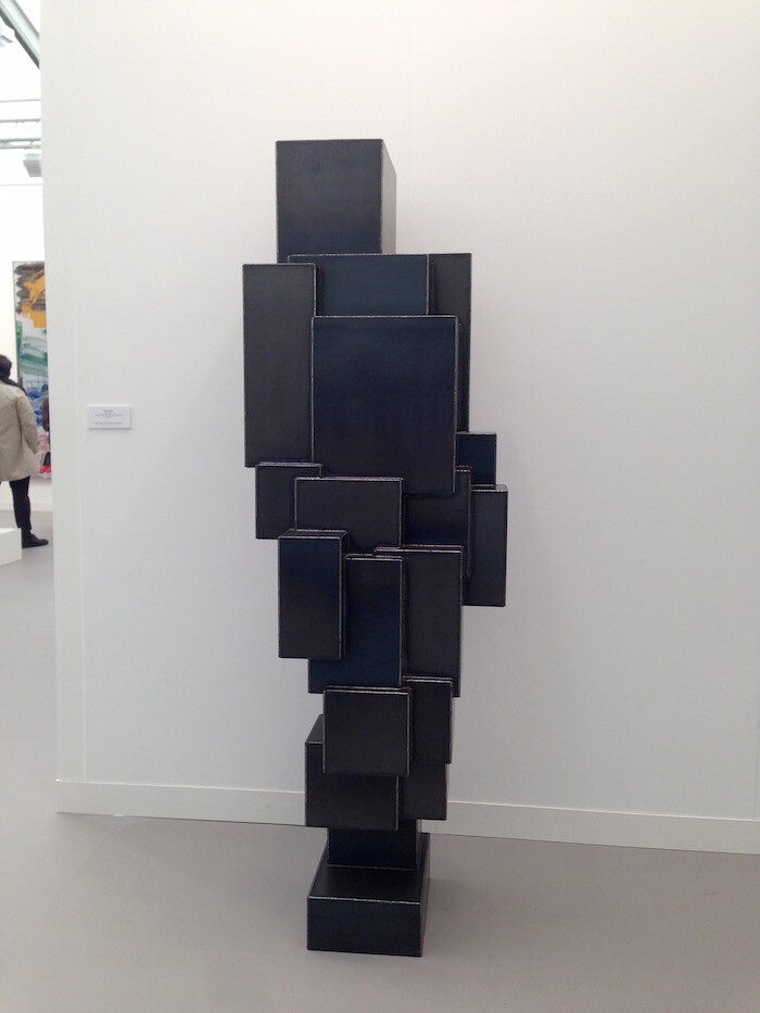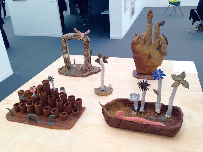 In keeping with a display strategy often associated with Frieze, established artists are hung on temporary walls or dolloped on gray carpet while suited sales reps huddle round laptops at nearby tables, jealously guarding stacks of high-spec business cards. In order to stand out from the crowd, certain galleries have jettisoned this white cube model in favour of a more considered approach. Hauser & Wirth is among the more successful examples at this year’s fair. Their precisely curated space is a grid of plinths on which are perched a diverse array of small, often beautiful works by a staggering number of well-known artists: Martin Creed, Subodh Gupta, Pipilotti Rist, Phyllida Barlow, Louise Bourgeois, Mark Wallinger, and Paul McCarthy, to name a few. The sculptures include a Perspex container housing prickly cacti, an upside-down teddy bear with a designer lamp stuck in its rectum, an inscrutable cast-metal replica of a cardboard box, and a chessboard covered with pebbles. The precision of this arrangement, which recalls the austere display strategies of a public museum, makes for an engaging booth in which unrelated works are brought into nuanced conversation with one another.