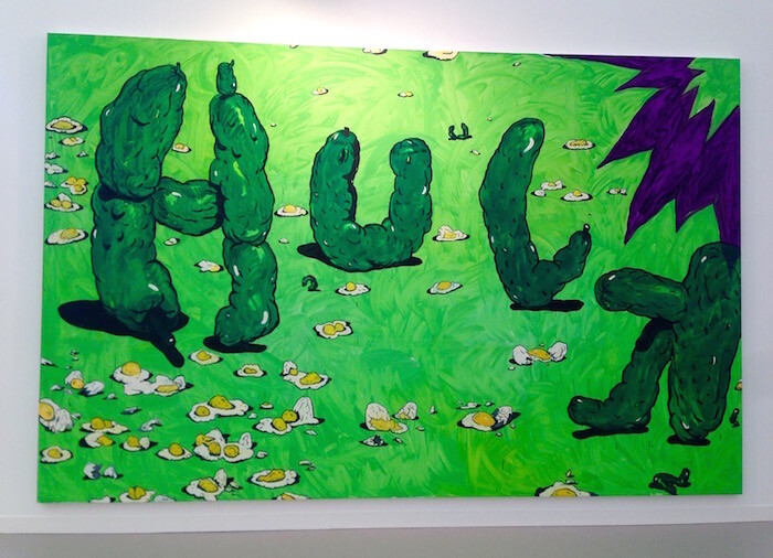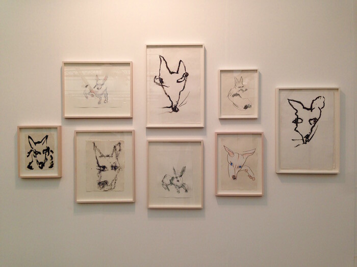 One of these is discovering unexpected connections between artists, flukes of correspondence that, given the nature of the fair, cannot have been orchestrated. In Untitled (2003), a framed series of charcoal-and-pencil drawings displayed on one wall of London’s Wilkinson Gallery’s booth, Joan Jonas has drawn and redrawn the same creature several times: a fox with sly, menacing eyes and ears resembling devils’ horns. The pieces, which evoke Trickster deities and Jungian archetypes with a series of gestural, loose-wristed marks, bring to mind a similar drawing shown as part of The Pale Fox, Camille Henrot’s 2014 solo show at London’s Chisenhale Gallery. It is gratifying, therefore, to encounter Paris’s Galerie Kamel Mennour’s booth, which is devoted entirely to new works by Henrot, a short while later. In Minor Concerns (2015), a series of large-scale watercolors, the artist explores the humor and shame attendant in domestic routine using elegant swipes and squiggles reminiscent of Jonas’s foxes. Henrot’s male and female characters masturbate over MacBooks, trip on beer cans, and wring water from their hair: the kinds of quotidian goings-on that usually take place behind closed doors. Frieze is predictably studded with overblown, cartoonish, eye-grabbing works (examples include Inflatable Felix [2014], a giant inflatable model of Felix the Cat by Mark Leckey, and Hulk 2 [2015], a lurid green painting by Armen Eloyan), but it’s the quieter pieces, among them Henrot’s and Jonas’s, that leave the most lasting impression.