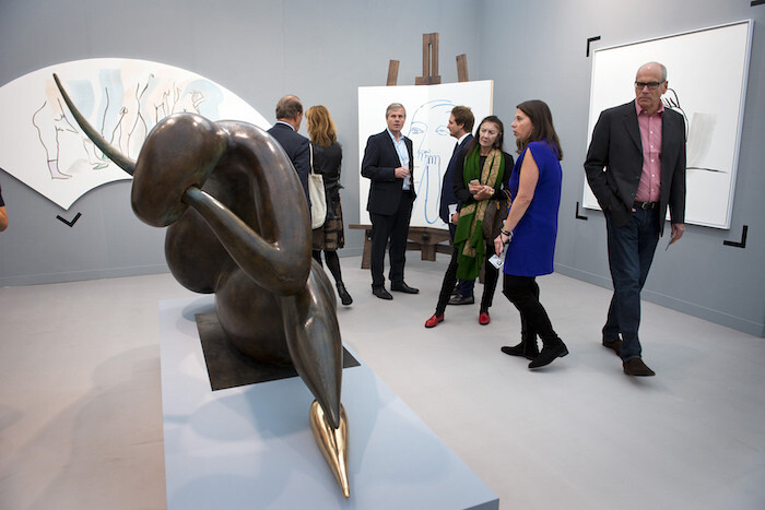 Kamel Mennour isn’t the only gallery to have given their space to a single artist. In a fair as crowded as Frieze, this approach—in contradistinction to Hauser & Wirth’s marshaling of dozens of big names—is a canny strategy for focusing itinerant visitors’ attention. London’s Stephen Friedman Gallery’s booth is given over to Cocktail Party (2015) by Tom Friedman: an installation of life-size sculptures featuring hipsters, dilettantes, iPhone obsessives, and rich folk in blazers, high-heels, and handbags—a mirror image of the Frieze demographic. Elsewhere, Gagosian Gallery has produced a lavish booklet to accompany their solo exhibition of drawings and sculptures by Glenn Brown. The works display the artist’s trademark deliquescent aesthetic, originally developed in his highly polished oil paintings, in which bodies and objects are evoked using rippling, shivering lines, making them seem forever on the verge of melting. Gagosian have clearly thrown a lot of money into anointing Brown as a serious artist but the work itself, though eminently sellable, is underwhelming.