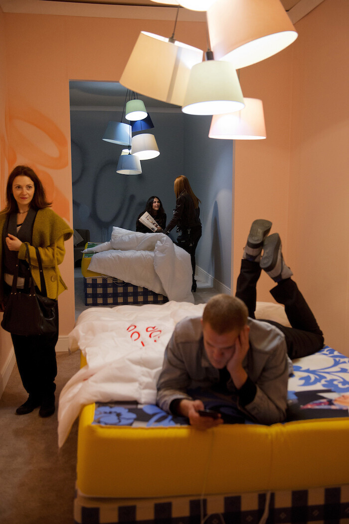 Across the way from The Sunday Painter is a white scale replica of the Frieze London tent (Untitled, 2015) by New York-based artist Rachel Rose, the winner of this year’s Frieze Artist Award. It is one of seven Frieze Projects: a commissioned series of works, shown in and around the booths, designed to boost the fair’s critical profile. I have to duck and crawl to enter Rose’s installation through a small door, as if enacting a scene from Alice in Wonderland. After awkwardly hobbling on bent knees past hanging light fittings, speakers emitting soothing lounge music, and other visitors’ outstretched legs, I lie down flat on the soft carpet and close my eyes. The work’s soundscape, which features music and muffled sound effects, mimics the experience of the wild animals who live in Regent’s Park, beneath and around the fair. Like another Frieze Project by the art collective ÅYR (formerly Airbnb Pavilion)—a Comfort Zone (2015) featuring a long sequence of pastel-hued rooms equipped with double beds on which visitors can sprawl, recharge their phones, and contemplate the mood lighting—Rose’s piece provides a welcome haven of sensory calm in the midst of a fair that lives up to its reputation for excess.