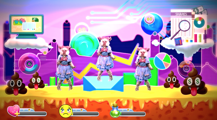 Of the four commissions, Rachel Maclean’s Again and Again and Again (2016) was the only work to take advantage of the project’s context and strict three-minute duration, creating an eye-catching music video that sped the viewer to the finish line. A chant of “we want data” morphs into a full-on techno-pop song, pushing Grimes-style vocals and visuals to a comic extreme. Data here is not just cellular; it’s also the data the government mines from our communications, the materials it requires for immigration, our digital footprint. Maclean’s video was not only the most absorbing of the group, but also the work that—despite engaging in fantasy and visual excess—offered the deepest insight into to our contemporary situation.