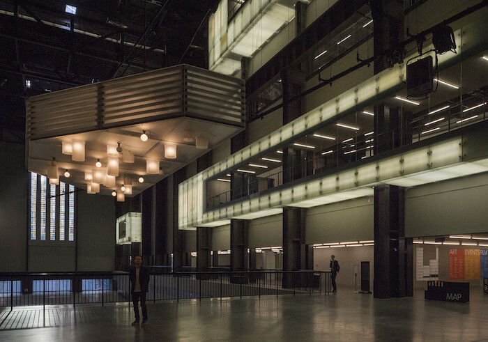 If the best works from Experimenta reanimated history, Parreno’s Anywhen animates the bodies of its viewers. The work utilizes the cavernous space of Turbine Hall, augmenting its architecture with light panels, a large carpet on which visitors are invited to sprawl, and a massive projector and screen system which moves from the ceiling to the floor. Each of these systems interact in complex ways: flickering lights are triggered by sound, lighting elements move and cast shadows, fish-shaped balloons float freely around the space, bumping into walls or interrupting the projector beam. In this way, Anywhen is constantly shifting, a flowing ecosystem of energies that viewers orient themselves in relation to. Over several visits, which because of the always-changing configurations of the work result in different experiences of it, Anywhen gains an alluring strangeness, a persisting sense of unfamiliarity. When one realizes the whole installation is controlled by bio-reactive microorganisms, viewable inside a glass room in the far end of Turbine Hall, the character of the work becomes clearer. Music, video, and shifting sculptural forms lull audience members into positions of repose and contemplation not possible in Frieze Film and Experimenta.