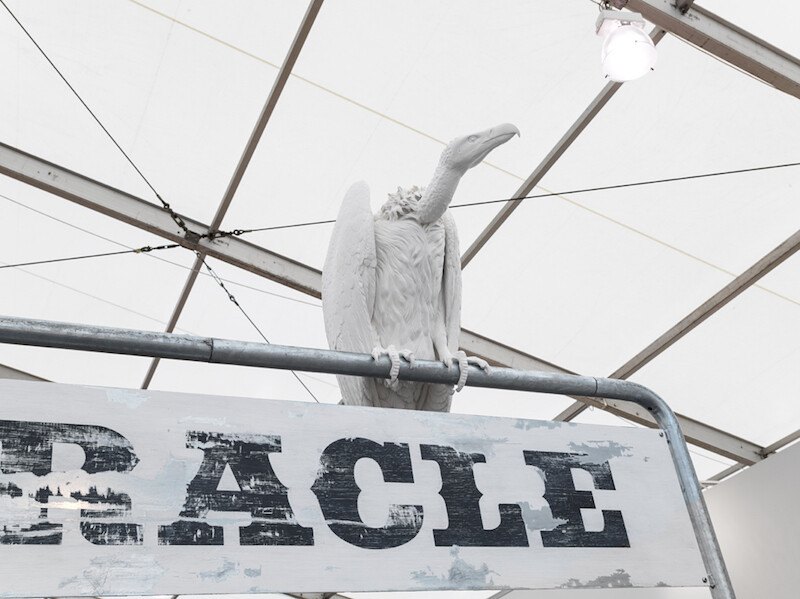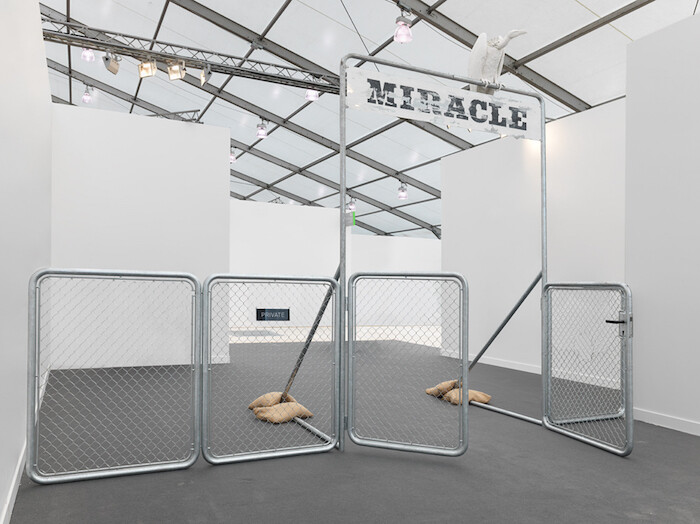 The first thing I saw upon entering the tent at Frieze New York was Elmgreen and Dragset’s Rite of Passage (2014) at Massimo De Carlo, a tattered sign bearing the word “MIRACLE” with a white vulture perched on top, flanked by lengths of torn chain link fence. This dismal tableau fitted the mood: when I left my apartment for the preview on Thursday morning, Congress was, for the second time in as many months, debating a bill that would return millions of Americans—including most of the artists and writers I know—to the ranks of the perpetually uninsured.