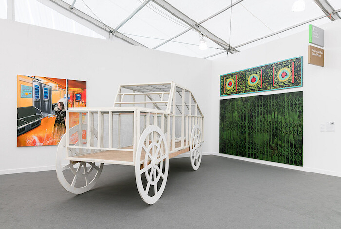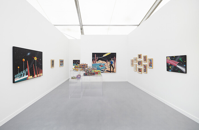 That’s not to say that ambitious booths were altogether absent: the Frieze Stand Prize-winner, New York’s PPOW, brought together street-art inflected works from the downtown New York scene of the 1980s—Martin Wong, Charlie Ahearn, David Wojnarowicz—alongside a recreation of Anton van Dalen’s installation The Pigeon Car (1987), a pigeon coop with live birds in the shape of a car (the artist has maintained his own rooftop coop in the East Village for decades.) A few booths over, another New York gallery, Canada, decided to embrace the eclectic booth principle, allowing Marc Hundley to arrange small paintings, prints, sculptures, and books by his fellow gallery artists within a pseudo-domestic interior modeled after his own studio apartment, replete with a bed, couch, and shabby carpets.