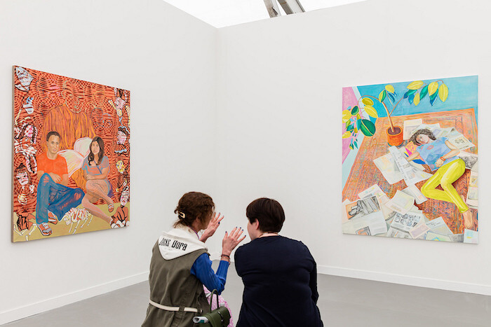 As is often the case with Frieze, the highlights of the fair were mostly found in the sections devoted to smaller galleries with tightly curated booths. In the Frame and Focus sections, selected by curators Jacob Proctor and Fabian Schönleich, Warsaw’s lokal_30 brought an intergenerational trio of Polish women artists. A grid of photographs from pioneering feminist conceptual photographer Natalia LL’s series “Sztuka Postkonsumpcyjna” (Post-Consumer Art, 1975) and “TAK/YES” (1971) was placed alongside Zuzanna Janin’s video Walka/Fight (2001)—in which the artist boxes the professional heavyweight Przemysław Saleta—and new paintings by the emerging artist Ewa Juszkiewicz based on eighteenth- and nineteenth-century society portraits. Walden Gallery, from Buenos Aires, brought a series of spare conceptual works on paper from the 1970s by Ulises Carrión, with a vitrine of fascinating ephemera related to his work as an artist, publisher, and poet at the center of the booth.