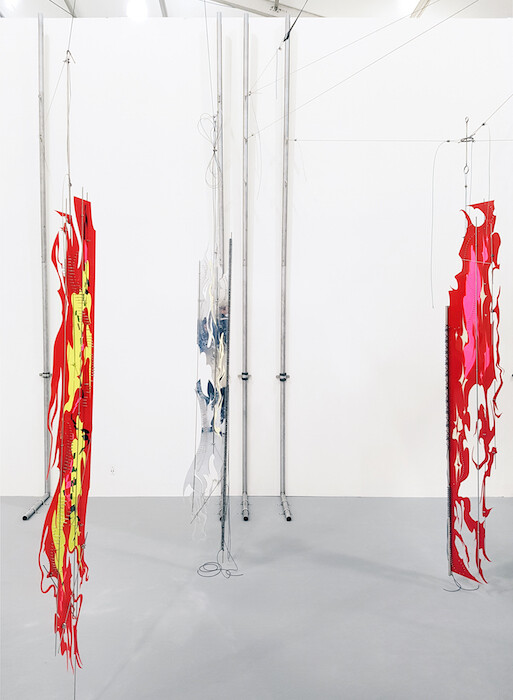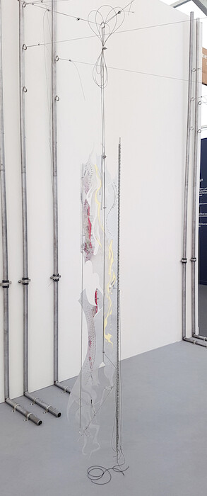 An enduring preoccupation with the urban fabric of New York can be found in some of the presentations from younger galleries in Frieze's Frame section, a designation for galleries established within the past eight years. Valerie Keane's installation for Paris gallery High Art features a series of cut-out plastic sculptures in silver and neon-red dangling from the criss-crossing wires of a chaotic stand-like structure within the booth. The actual sculptures, such as Orchid Code (2016), which have long been a staple of Keane's practice, are suggestive of blades in their sharpness, while their motifs recall the seedy architectural ornamentation of casinos, condominiums, and red-light districts, and convey a gritty urban vernacular that codes the city as a punishing material environment.