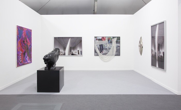 Larger galleries, meanwhile, exude an air of business as usual, and many are presenting reliable bodies of work from their established artists. Fred Wilson at PACE is particularly satisfying, showing sculptural pieces from the last decade, eloquently playing with the iconographies of national and cultural affiliation and belonging. At Marian Goodman, a solo presentation by William Kentridge mixes his steampunk-esque sculptures, collages, and a stark new series of prints in Indian ink depicting mythological scenes. Corresponding with the artist's current exhibition at the gallery, Casey Kaplan is showing the work of N. Dash, which turned out to be one of the day's understated highlights. In dialogue with painting and post-minimal sculpture, Dash integrates fabric into multilayered assemblages (all Untitled, 2016) that, for all their austerity, possess a softness and tactility that make Casey Kaplan's booth feel like a sanctuary in a fair that otherwise tries far too hard to be excessive.