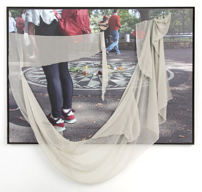 In the Focus section, Los Angeles's Night Gallery presents a number of pieces by Rose Marcus, who blends her photographic practice with elements of installation. Imagine Red (2016) drapes a beige piece of silk from a string, which hangs in front of a photo of people congregating in Central Park—a man strums a guitar, and in the immediate foreground a girl stands in tights and a bright red backpack. Stripped of context, and seen against three other photographs of grainy, surveillance-style images taken inside New York’s Metropolitan Museum of Art, Marcus's work suggests an abstract and menacing but occasionally beautiful urban landscape.