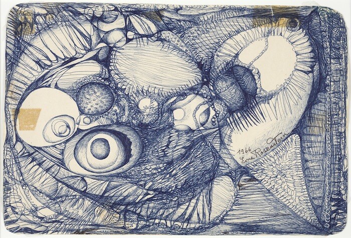 It can be easy to forget amongst the anonymizing mass of booths, but art fairs aren't bad places to encounter work you're unlikely to see at a New York gallery anytime soon. This year, Rampa from Istanbul is showing the work of four Turkish and Eastern European artists, among which Nilbar Güreş was a personal favorite. Her work examines the cultural codes of gender and sexuality, and here was represented by two pieces on fabric and paper respectively; the former is cute and whimsical with its sparse stitching of figures onto soft blue fabric, playfully titled Die Gärtnerin: Vaginal Fisting (2014). There is a notably strong historical component to this year's fair, and a set of four drawings by mid-century surrealist Erna Rosenstein, who was recently included in the Jewish Museum's “Unorthodox” exhibition (2015–2016), were particularly refreshing for the oblique historical lens in which they were found: at the booth of Warsaw’s Foksal Gallery Foundation, among the works of other artists active in the Polish capital in the 1960s and 1970s.