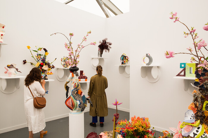 More recently, the inverse of this dynamic has taken hold as prominent art fairs strive to resemble biennials. In what might be called “the Frieze effect,” fairs have increasingly incorporated discursive or participatory elements; they have also emphasized site-specific commissions and educational programs. The most obvious explanation for this shift is that it functions as a fig leaf, politely disguising the shameless promiscuity of the ever-tumescent contemporary art market. Yet as with biennials, the semblance of autonomy is a potent means of value production. Biennial-icity adds a veneer of intellectual sophistication, allowing work to be marketed as “critical.” It also allows a fair and its exhibitors to align their brands more strongly with the global contemporary, a now-ubiquitous category that invokes an abstract, near-empty universality. Given that this universality is in many ways indistinguishable from that of neoliberal capital, we might conceive of the global contemporary as a potent aesthetic ideology. Within this fantasmatic structure, the fair assuages its patrons’ fear of missing out even as it indulges their desire to discover (then flip) the next Oscar Murillo. The links between these imagined affinities and the conventions of pricing are at once indirect and indisputably real.