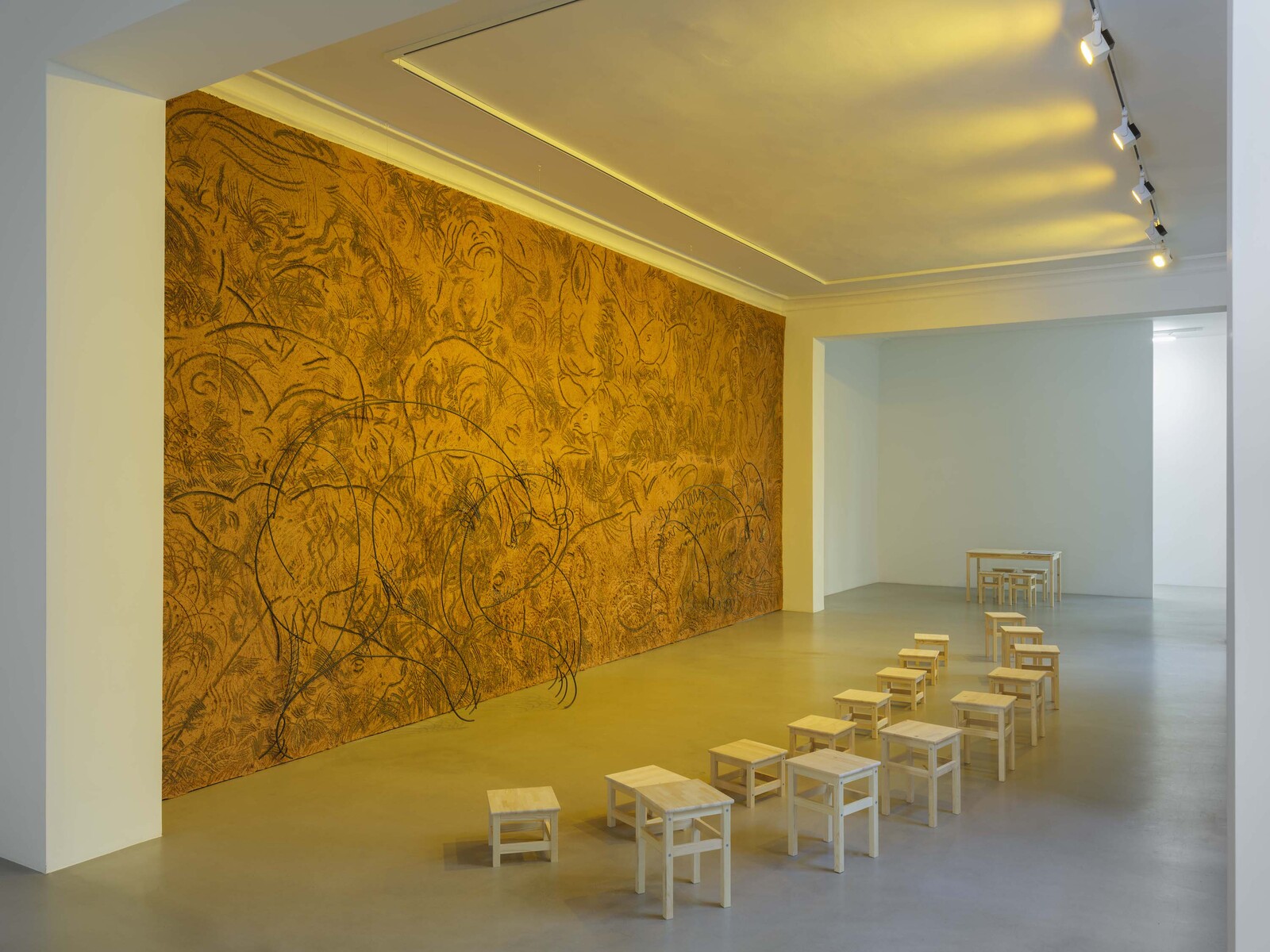 “Los jóvenes olvidaron sus canciones o Tierra de Fuego” [The youth forgot their song or Land of Fire] marks a significant evolution in the artist’s practice, revising his trademark forms and expanding his investigation into sculptural space. For his 2023 exhibition “Usos y costumbres” [Customs and habits] at Studio Voltaire, London, he covered the walls of the former Victorian chapel with clay. Here, he responds to the old premises of Deko Behrendt, an iconic party decoration and mask shop in Schöneberg. It feels fitting that a place historically associated with festive disguise and queer community building is transformed into a pre/trans/post-human cinema.