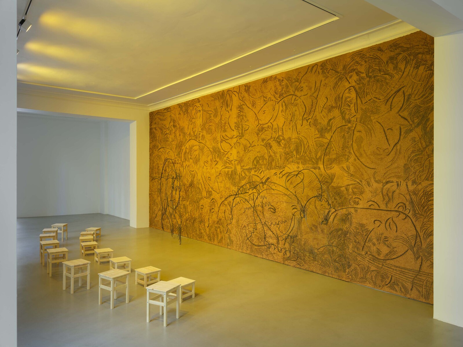 While Chaile’s familiar semi-figurative sculptures have a penetrating gaze, these tapirs have no irises. The void of their empty eyes seems to point towards the species’ extinction, and this allusion is consistent with his entire oeuvre’s address to the decimation of Indigenous life. Filling the room, an audio piece in English and Spanish relates the myth of two baby tapirs who came down from the sky and slowly metamorphized into humans while terraforming their forests through fire and wit. While the childish imaginary of the mural and story is tainted by sadness—yet another tale of human disaster—this new cinema also brings hope, suggesting the possibility of reimaging humanity’s place in the world through storytelling and dreaming. We might recognize ourselves as kin to the tapir, attempting to rebuild our identities based on respect and honor for those with whom we share the world.