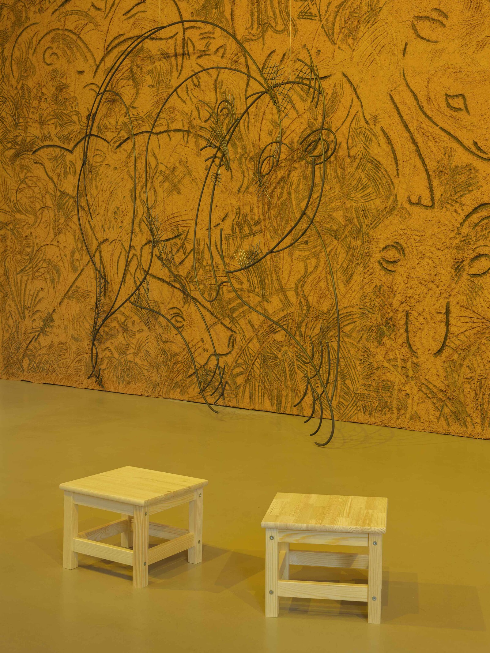 In this cinema, the audience face an eight-meter-wide adobe mural on which overlapping charcoal drawings of tapirs have been etched. There are full-body representations of the charismatic animals native to South America and South Asia—some so large that they contain smaller tapirs within them—and figurations of their heads or profiles. Nonetheless it is clear that this is a group, a clan, a rowdy ensemble, and not a single tapir drawn many times. Plants and vegetation are minimally represented by lines that grant movement, ground, and depth to the multiplicity of animals. Two large tapirs, outlined in welded steel, detach themselves from the group and project their shadows onto the screen, generating a three-dimensional experience of this film in mud and clay.