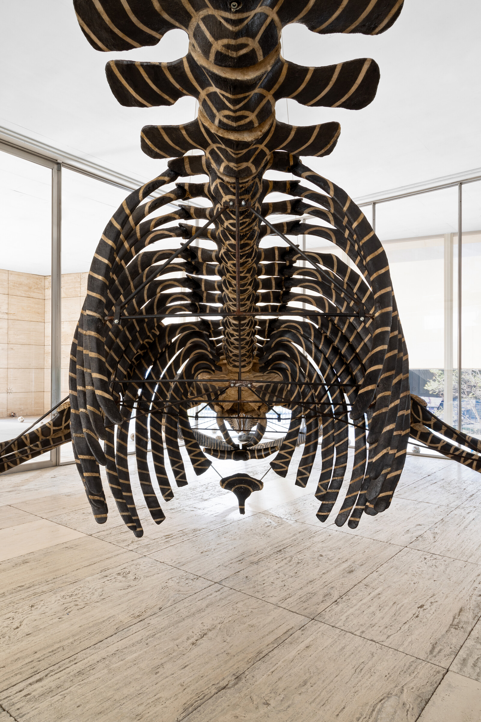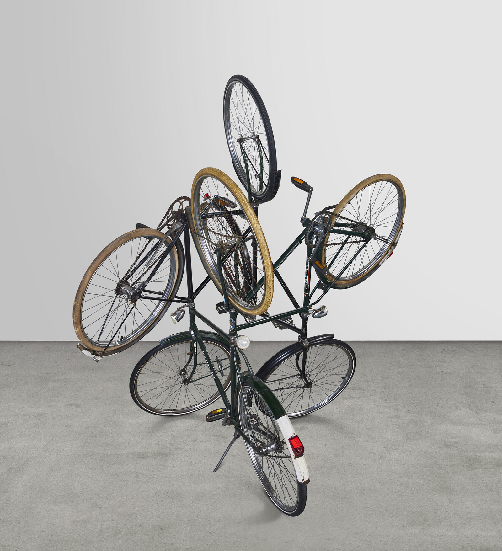 The third gallery, “Water: Aquarium” houses the impressive pseudo-fossil Dark Wave (2006), a resin cast of a whale skeleton painstakingly decorated with concentric circles drawn with graphite. It hangs in the glass-walled space as if in captivity (much like its sibling at the Biblioteca Vasconcelos), surrounded by a terrace on which Four Bicycles (There Is Always One Direction) (1994) is presented. An archetypically Orozcoesque piece, its eight bicycle wheels include some of his favorite themes: circles, rotation, sports, and perhaps above all his embrace of nomadic internationalism. Crucial to the early success of pithy formal experiments such as this is their legibility to global audiences. Viewers do not need to know that the piece takes inspiration from Rotterdam, the bike-friendly city in which it was made, to appreciate its witty and surrealistic qualities.