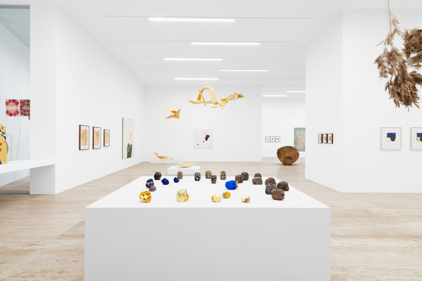Indeed, something about the concentration of objects in this room plays against the most exciting ones: My Hands Are My Heart (1991), the well-known diptych of two hands pressing clay—including the heart-shaped form (Model [My Hands Are My Heart] Version 2, 1991), resting among a larger group of anatomically inspired pieces—and the lovely and gross “Lintels” (2001/24), a series of raggedy gray sheets hanging from tensed lines and pressed from lint collected from clothes dryers. Displayed here in the company of numerous less-impressive pieces, these successes feel serendipitous rather than considered—like, we get it, Orozco is playful. But the exercise is almost too revealing, suggesting a lack of intentionality. The feel is of an artist throwing stuff at the wall to see what sticks—spit, probably.