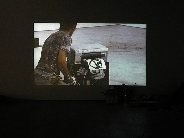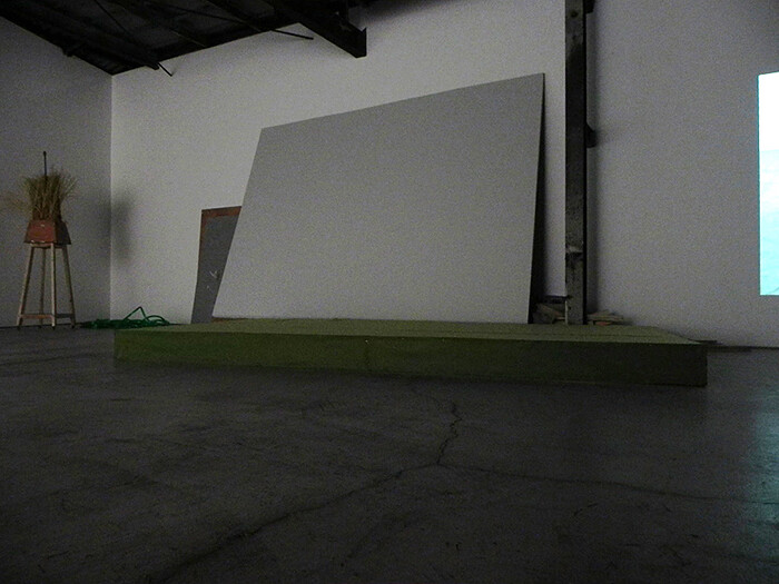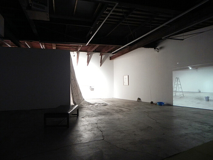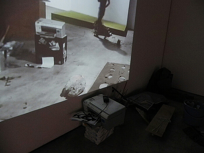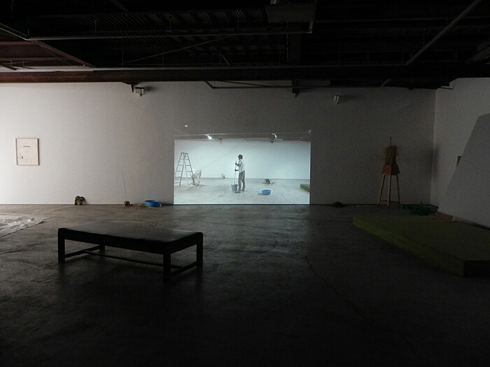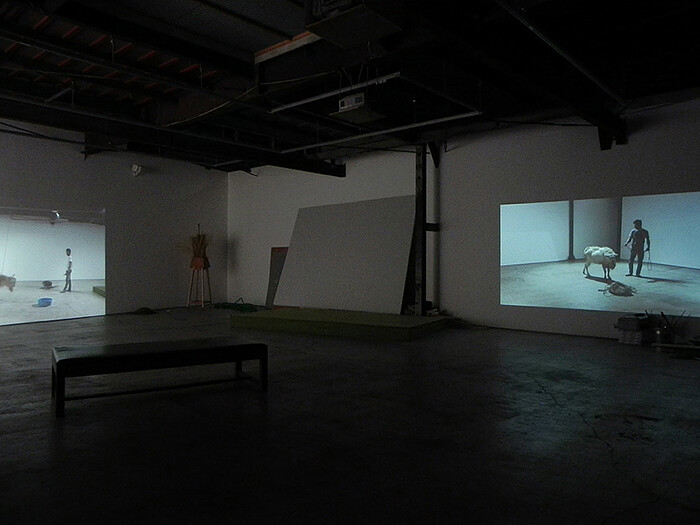 In the week preceding the show, Nakano set up a provisory installation on-site with some objects. He then installed a male goat and continuously transformed the installation as the goat freely moved in the space in reaction to the installed objects as well as the artist’s presence and intervention. Their interplay for three days resulted in a spontaneous but not chance-operated installation, and the entire process is recorded on video. Before the opening the artist cleaned up the space, removed the objects, and effaced any traces (dirt and scratches) of the goat, so that the only remains of this process are two video projections humorously documenting the artist’s solitary play with a goat.2