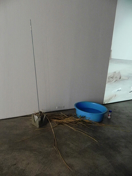 Under these conditions, Gaku Nakano’s first solo show at Kodama Gallery, in Kyoto, especially his installation Listening to a myth told by a goat (2015), displays a typical reaction among artists who are satisfied by neither relational art nor formalism—in other words, those who refuse to make any institutional “relations” (communications, interpretations, functions, etc.) or any substantial “works” (physical objects). We are already familiar with an art form that is non-objective, site-specific, and that occurs here and now, resisting the art market’s easy distribution and merchandising: the happening. Nakano’s installation also starts as a kind of happening or performance, which, however, is not performed, but that rather presents something as having “happened.”