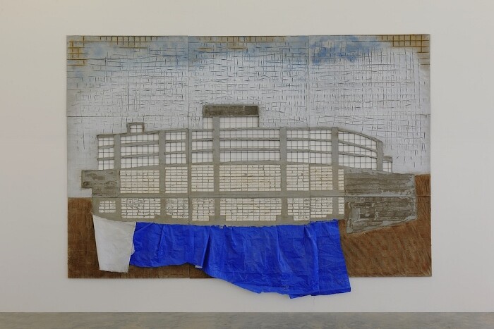 Bringing the exhibition full circle, Marwan Rechmaoui’s mural Untitled (2015) addresses the possibility of painting or, rather, mark-making to inspire a greater awareness of the city that the viewer inhabits. An expanded painting composed in concrete, plastic, and paint, the work combines physical materials from Beirut’s urban landscape with a picture of an ominous-looking building. In a changing city (perhaps not so ironically, one of the hippest bars in Beirut is called Under Construction), the act of building is destructive, defeating the two-dimensionality of any purely pictorial representation. Questioning the boundaries, or lack thereof, of the overlapping spaces that we inhabit, Rechmaoui’s large-scale work is an ode to the quotidian reality of the city and the region.