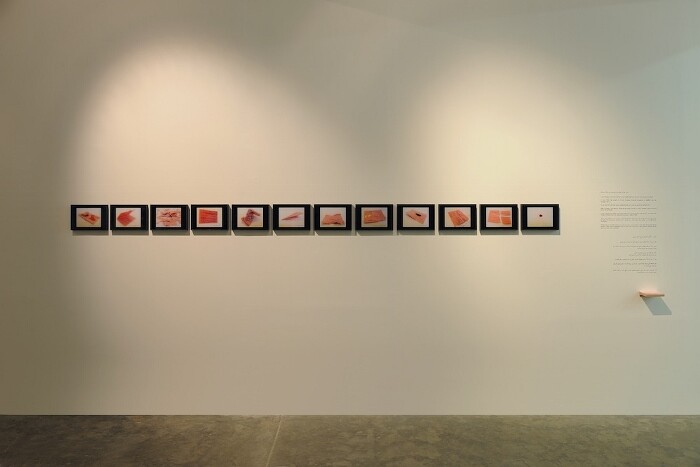Rabih Mroué’s The Crocodile Who Ate The Sun (2015) consists of a set of 12 framed photographs, presented in a row next to a wall text and, underneath it, a small shelf with leaflets, and the work resonates with an awareness of its own objecthood (though in a different sense from the self-conscious theatricality proposed by Michael Fried). The text, in English, informs visitors that the leaflets are reproductions of an original that “fell from the sky” in 1982, dropped over Lebanon by the Israeli Air Force. The artist presented these leaflets to his friends, and the photographs document their reactions—the leaflets torn, burnt, creased, and crumpled into balls. Mroué thus brings a staged event into the gallery, objectifying an experience that conjures up an earlier one to recognize the problematic nature of commemoration. Every commemorative act excludes another, so is there a more effective way to remember than through the gestures of these individuals? The violence inflicted on the leaflets, monumentalized through the act of photographing and framing them, is appropriate to the politically sterilizing space of the gallery.