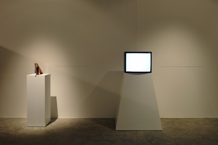 Iman Issa’s Material for a sculpture commemorating a blind man who became a great writer, opening up an unparalleled world of possibilities to the people of his nation (2010–2012), a flickering tube monitor atop a flared pedestal, is a monument for our present, dysfuntional times, remembering and commemorating through the absence of an image, aware of its own platform, an object that acknowledges its own representational failure.