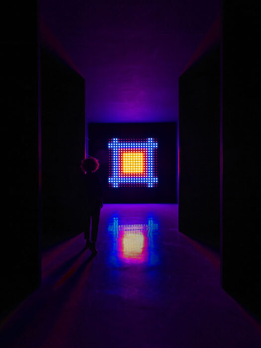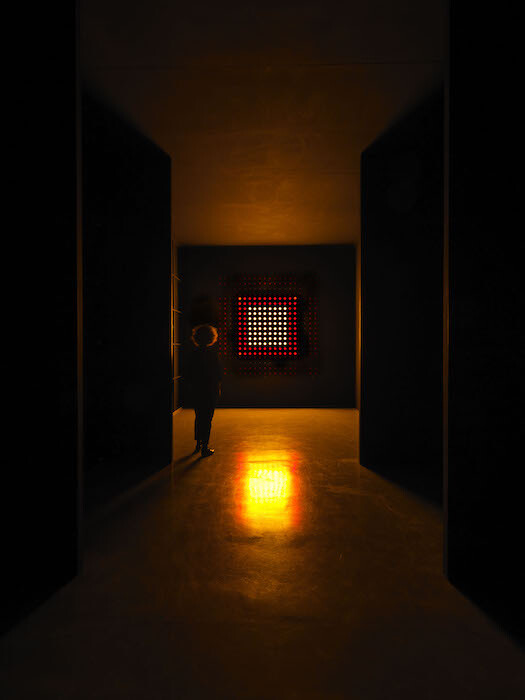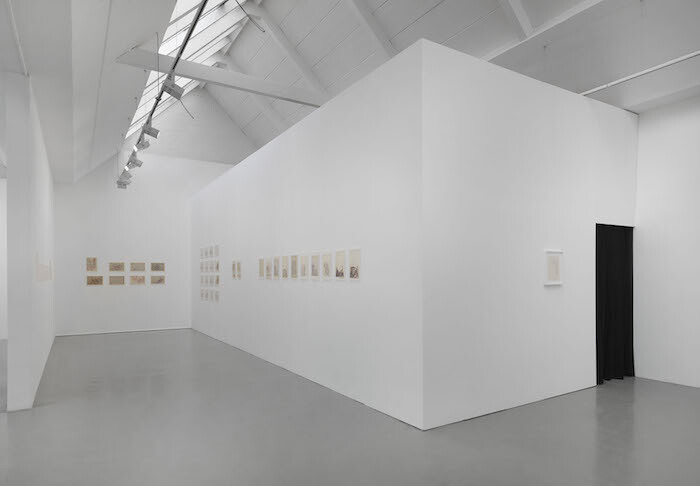 At Galerie Barbara Thumm, Peruvian artist Teresa Burga shows a similar interest in involving the viewer, or “user” in Posenenske’s parlance, in the artistic realization of a redistributive social project. She was part of the Arte Nuevo group—an artist collective formed in 1966 by Luis Arias Vera, Gloria Gómez-Sánchez, and Burga, among others—which critically confronted official institutions in Peru by consolidating a multifarious Peruvian avant-garde. Entitled “Conceptual Installations of the 70s,” the exhibition reunites a series of text-based drawings that seek to expose the constructed and self-referential limitations of linguistic and, more broadly, representational structures. Upon entering the gallery, visitors encounter the series “Borges” (1974-2017), 46 drawings and diagrams conveying the possibility of deconstructing and materializing linguistic data from Jorge Luis Borges’s poems. The installation is accompanied by a sound piece in which Borges’s “La Noche en que en el sur lo velaron” [The Night in which he was mourned in the South] is stripped of words and interpreted in musical notation. Exhibited for the first time in Europe, the installation Obra que desaparece cuando el espectador trata de acercarse (propuesta III) / Work that Disappears when the Viewer tries to Approach it (Proposal III) (1970-2017) staunchly attests to Burga’s interest in the agency of viewers who darken the work as they approach a large quadrangular light panel. Like Posenenske, Burga, a driving force of artistic experimentation in Lima, took professional leave from producing and exhibiting art for over two decades.