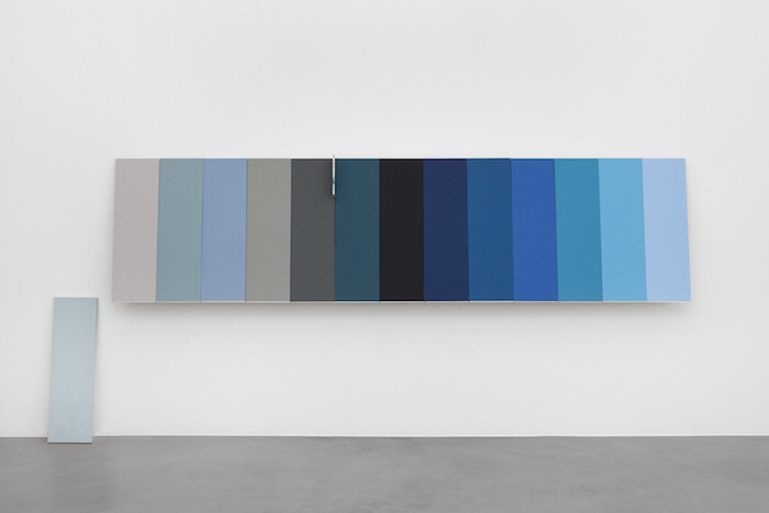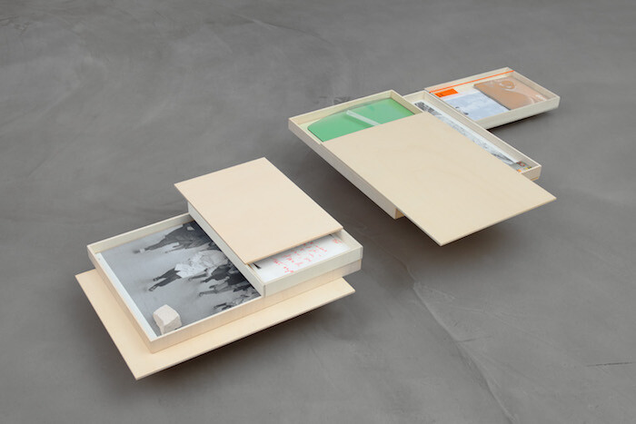 At Arratia Beer “DEMO,” by the Portuguese artist-cum-speculative architectural historian Fernanda Fragateiro, departs from the book Demo: Eine Bildgeschichte des protests in der Bundersrepublik [Demo: A picture of the protests in the German Federal Republic] (1986) to survey and trace the material evidence of a violent protest against increasing public transit prices in Frankfurt in 1974. Within this multilayered installation of found evidence, books—a recurrent leitmotif in her work—appear in several works. They can be seen in the plywood research modules Materials Lab (demo) (2017) and the polished stainless steel sculpture having words (2016), not only as physical volumes and symbolic containers of historical resistance, but also as paratext: an architecture of words and bodies to re-enact the riot. At Galerie Tanja Wagner, modern architecture structures Kapwani Kiwanga’s judicious and elegant presentation of her ongoing research into the social hygiene movement of the late nineteenth and early twentieth centuries. A black line drawn from the 1905 International Congress on Tuberculosis encircles the entire gallery and divides the space for six drywall paintings, a sound installation, and a video projection. While Kiwanga’s camera haptically surveys color coatings on built surfaces in the video work A Primer (2017), three works from the series “Linear Paintings” (2017)—Linear Painting #1 Birren Blue-Greens (RR Donnelley & Sons Chicago, Illinois), Linear Painting #2 Birren Peach-Terracotta (RR Donnelley & Sons Chicago, Illinois), and Linear Painting #6 Birren Yellow-Grey (RR Donnelley & Sons Chicago, Illinois)—further investigate the verticality of therapy and care as proposed by Faber Birren’s 1950s color theory. Kiwanga dissects Birren’s two-tone color palettes, placed in corporations, prisons, and psychiatric asylums for their therapeutic effects, thus evoking the schisms in modern disciplinary architectures and colonial politics.