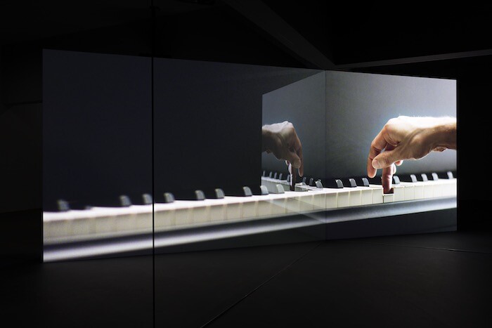 The hegemony of the linguistic reappears in Dara Friedman’s multi-channel video installation Dichter [poet] (2017) presented at Supportico Lopez. Sixteen actors adapt Jerzy Grotowski’s voice training techniques to interpret poetry ranging from Charles Bukowski to Johann Wolfgang von Goethe. While amplifying the voice and culling the body, Friedman’s large vertical projection opposes narrative regimentation, appearing in an unsynchronized, overlapping cacophony. The appropriation of cut-up narrative fragments and polyphony continues at Esther Schipper, which inaugurated its new space in Schöneberg with Anri Sala’s Take Over (2017), a back-to-back double-channel projection intersected by two glass panels. The video plays with political and cultural history as seen from the perspective of a prodigious yet frustrated pianist. Centered in the main gallery space, the cross-shaped freestanding structure immerses the viewer in a musical universe of refracted piano keys, players, and politics. As the pianist performs “La Marseillaise” (1792) and “L’Internationale” (1888), multiple iterations of his hands allude to a collective history of revolution and reform. The reflected multiplicity sets in resonance a critical and semantic analysis of the standardization and appropriation of the two anthems.