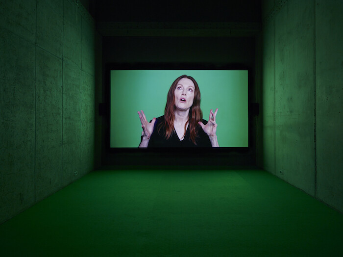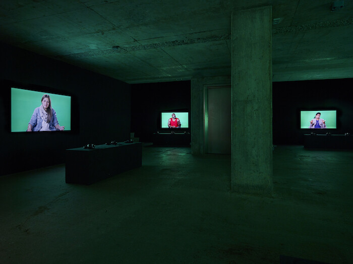 Multiple voices are also at the core of one of the most anticipated exhibitions of the weekend: KOW’s show of Candice Breiz, who will co-represent South Africa with Mohau Modisakeng in the 57th Venice Biennale. Theatricality and re-enactment are ever-present in Breitz’s moving image works, which examine the literal and figurative demands of lending voice as a practice for inhabiting history. In Profile (2017), Breitz employs ten prominent South African artists who might equally have been nominated to represent the country in Venice. Assorted overlays and performative speech acts disrupt the markers of credibility associated with any portrait of gender, class, and race, as each voice states “My name is Candice Breitz.” The first part of the seven-channel video installation Love Story (2016) can be seen on the floor below. Featuring Alec Baldwin and Julianne Moore, it is based on the personal narratives of six individuals who fled oppression in their countries. Breitz tests the mechanics of identification by asking Baldwin and Moore to re-enact the narratives of a Syrian refugee, a former child soldier from Angola, a survivor from the Democratic Republic of the Congo, a transgender activist from India, a political dissident from Venezuela, and a young atheist from Somalia. By enacting their stories against the backdrop of a TV studio setting, the same that provides a background to the six original interviews (which are shown one floor below), Baldwin and Moore foreground an economy of exceptionalism purported by the hegemonic Western storytelling industry. Beyond offering some personal release in a weekend of split attention, Breitz’s fast-moving and illocutionary editing is fitting to the fragmented response to the global refugee crisis.