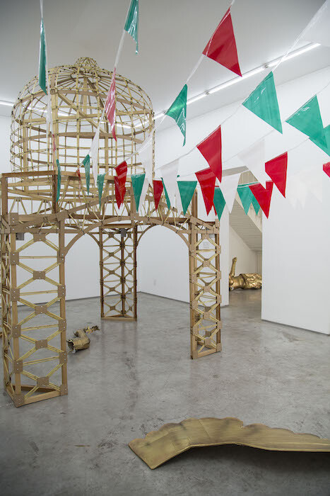 Spanning a room at Galeria Enrique Guerrero is Adela Goldbard’s El salón de los pasos perdidos (2017), an airy stick-and-cardboard scaffolding in the shape of one of Mexico City’s most overbuilt civic symbols—the Monumento a la Revolución. The four-sided triumphal arch, guarded at its corners by the towering socialist-realist figures of workers, mothers, and architects, is in fact the cupola of an unfinished palace, re-appropriated by the people when the money ran out. The first stone was laid on Independence Day, 1910, the same day that the Monumento a la Independencia was unveiled (a polished bronze angel topping a martial column) on September 16. In an adjoining gallery is Ángel caído (2017), a reed-and-paper version of el Ángel, broken to pieces, as the original version was in a July 1957 earthquake. By the following September 16, it had been restored. It’s as if there are no coincidences.