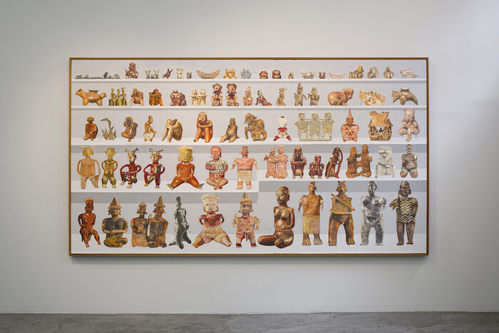Like a paper Angel of History, the fifth edition of Gallery Weekend Mexico City looked backwards at the accumulated rubble of the past—though, as with any country that has cycled through several empires, not all was the result of seismic activity. A remarkable number of shows ventured an artistic sort of anthropology. In the savviest example, at Labor, the Columbian-born, L.A.-based artist Gala Porras-Kim’s exhibition “An Index and its Settings” presented pencil renderings of west-Mexican ceramic statuettes from a named collection at LACMA, filed not under artifacts but objets d’art. In a dramatic color drawing (78 west Mexico ceramics from the LACMA collection: Nayarit Index, 2017), a few dozen are indexed by scale—an obvious formal quality, cheekily divorced from any real knowledge about the objects’ origins or meanings. Another group of contemporary, clay-brown ceramics took the generic forms of ancient pieces—banana/boat, two-headed animal, seated human figure; each came with a GPS tracker attached with monofilament in order to, as the artist put it, locate the objects in time and space.