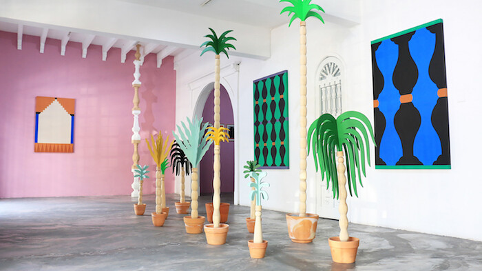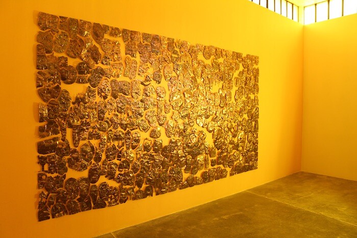 Porras-Kim wryly points out what others take for granted or even promote—a prevailing abstraction of historical forms. A more hapless show, “Trompe-l’oeil,” came courtesy of Celaya Brothers, where the Italian artist Agostino Iacurci spent several weeks translating the decorative qualities of the megalopolis into a series of graphic paintings of banisters, doorways, and posts (Balaustradas No. 3, 2017; Entrada muy pequ 3w No. 6, 2017; Planta 11, 2017). At Museo El Eco, Théo Mercier installed his site-specific Gold War Wall (2017), a mural comprising 300 battle masks recreated in brass from images in museum catalogs. For a concurrent solo presentation at Marso Gallery, Mercier folded the aesthetic of Mexico City’s cinderblocks and tiles into an already overflowing mixture of cultural citations: replica Olmec trinkets, “African” motifs, combined in plinthed-up, Brancusi-esque stacks. The show is called “Phantom Legacy”; the parquet floors covered in what the gallery’s press release describes as the debris from the exhibition space’s old walls and ceilings, but that looks like a fine-grained layer of cat litter.