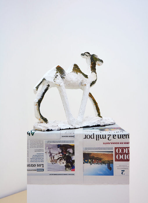 At Lulu, German-Iraqi artist Lin May Saeed was installing “Djamil” when the quake hit, and couldn’t get back into the space for a couple days. When the show resumed, she set Djamil sculpture (2017)—a Styrofoam and plaster maquette camel—on a plinth wrapped in that day’s newspaper which, when folded, happened to reveal a photo of Frida, Mexico’s most famous rescue dog.(1)