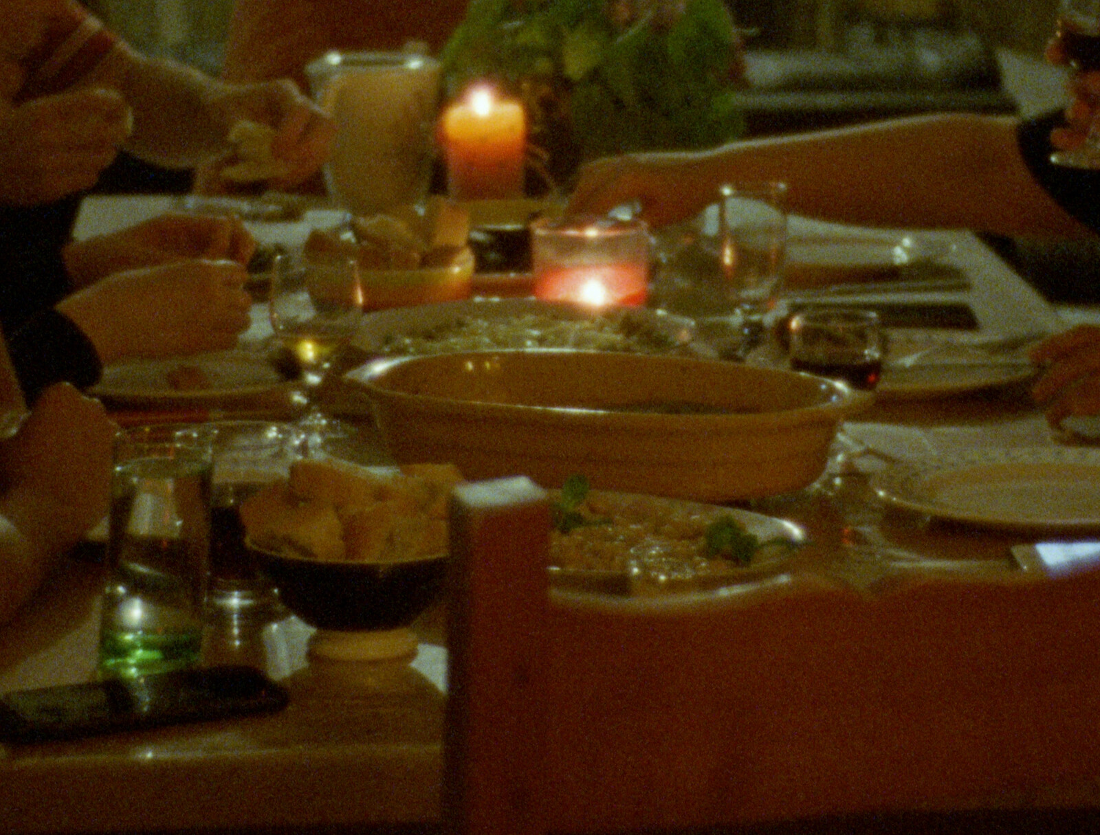 The process by which The Retreat came into being is not made explicit, and on the rare occasion the participants appear on screen, their faces remain out of sight. Abstracted, glimmering 16mm footage shows them eating together and sewing costumes, alongside the unidentified buildings which make up their lived environment. It is mostly through the layering of quoted text, voice, and abstracted documentary images that the film’s (and the exercise’s) political urgency comes into focus: embracing cinema’s haptic qualities to find a filmic language for an inherently bodily, live experiment in community-making.