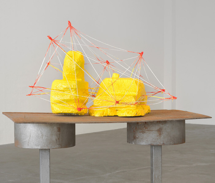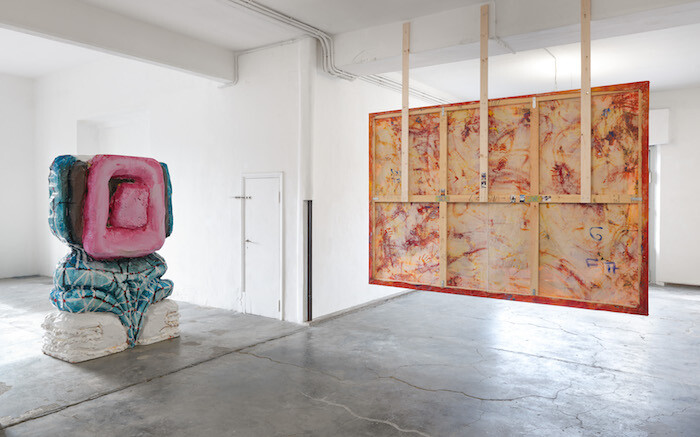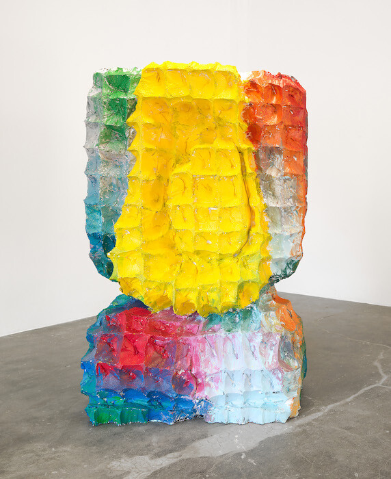 His last name is Greek, as is his first, which means “old age, elder.” Yet Gerasimos Floratos looks even younger than his thirty-one years. When I meet up with him at Armada, a few hours before the opening of the show, he has peroxide blond hair, a hoodie two sizes too large, and a notepad full of drawings tucked under his arm. His manner is polite and cheerful, putting emphasis on the importance of art to him. He’s also curating exhibitions for several galleries at the moment. Fully in the swing of things. Floratos was born in Manhattan, but his roots are grittier: his father, who runs a deli in Times Square, moved to the US in the 1970s from Cephalonia—the sculptures on view here, which can be easily picked up and transported, were made at his paternal grandmother’s house on the Greek island. In New York, Floratos likes to get around by taxi—a symbol of the city and part of its mythos, as is Times Square, for that matter. “The images that flash by outside blend together in my mind and then on the canvas,” he says, and it’s a motif that turns up over and over in his work. At Armada, for instance, we find Reverse Hackie Roleplay, a small sculpture placed next to pieces of scrap from the courtyard. If you look closely, you can make out a small yellow vehicle and a raised thumb, also yellow. “It’s a cab hailing itself.”