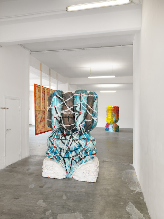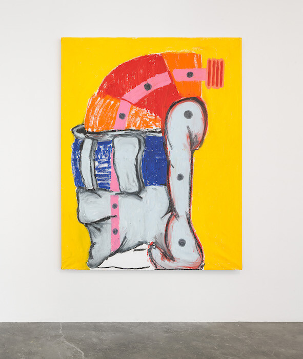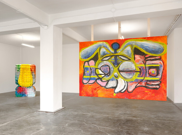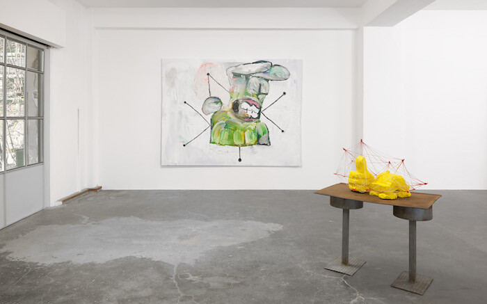 Gerasimos Floratos’s solo show at Armada, “Soft Bone Journey,” is comprised of three large paintings in oil and acrylic, and three sculptures, each the size of a person, made of painted styrofoam. (All works are from 2017.) The colors are bold—canary yellow, acid green, pinkish orange. His approach to both mediums—simple lines, rapid gestures, rounded forms—has the feel of street art, a style that seems all too familiar, yet remains utterly foreign. The subjects cannot be fully made out: at first glance they resemble digestive tracts, limbs, current collectors, crumpled billboards, tangled topographies. The titles, too, hint at things without saying them straight out: Internal Trash Dog, Soft Bone Slumper, Untitled (the paintings); International Soft Body, Town Square Alignment, Reverse Hackie Roleplay (the sculptures). Although the style is more abstract than figurative, they all vaguely point to the human sphere, something having to do with us. Not busts, but rather portraits, as Armada’s Georgia Stellin notes, “from the navel down.” We’re in the realm of autobiography.