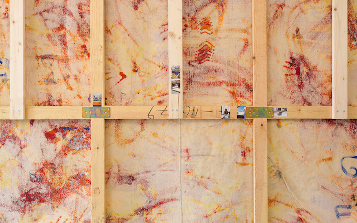 The photo used to publicize the show was also taken from inside a car: the rearview mirror shows a small white dog in the back seat, its muzzle all ruffled by the wind. “That’s my aunt’s dog,” he tells me, leading me towards the biggest painting, TBC, hung in mid-air rather than on the wall. He shows me not the front (where we seem to see two big, droopy rabbit ears against a carrot-colored background) but the back: “And that’s my aunt,” he adds, pointing to the photo of a woman winking over her sunglasses. Next to it are more snapshots: “Here’s my dad at the deli… my uncle crawling around like a cat… another white dog in a taxi…” These photos lined up on the stretchers seem like the artist’s attempt to remind himself where he comes from. While on the other side, the canvas holds the ungovernable figures of his many selves, which refuse to obey form, as Floratos says: with “broken hips and floppy bones,” and yet in transit. He says goodbye with a handshake followed by a fistbump and a whole dap routine that takes several attempts to memorize. He has an appointment in town and tries calling a taxi, since they can’t be flagged down in Milan. Somebody tells him there’s a taxi strike. He claps in excitement, amused: “No way!”