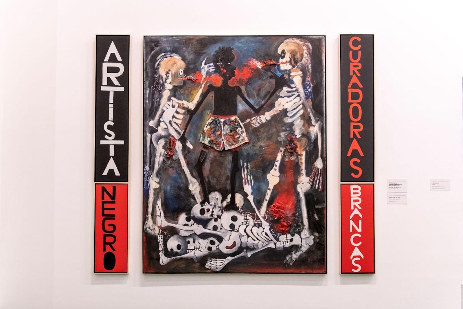 While Catunda and other white artists of the 80s Generation were based in Rio and met commercial success, de Paula, the only Black member of the group, chose to stay in Cuiabá, where he still lives. Later works more explicitly addressed race and power in the art world. In Black Artist, White Gallerist, a white woman in a geometric blue top and snazzy tights stares across at a screaming emoji-like Black face, while in Black Artist, White Curators (both works 2018), two white skeletons breathe fire in the face of a Black figure. Violence features in one of a series of work that riff on Philip Guston’s Klu Klux Klan paintings. In one, a smoking, hooded figure surveys another self-portrait of de Paula, like a critic considering his prey. Another shows two KKK members in distinctive white hoods riding a car through the Mato Grosso landscape. Alongside Guston, de Paula’s influences included German Neo-expressionism and Italian Transavantgarde, both appearing in force at editions of the Bienal de São Paulo in the mid-80s and which influenced peers such as Leonilson and Antonio Dias, who had more opportunity to travel to Europe.