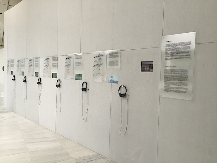 Despite the performative mandate, works addressing architecture skew uneven. The show opens with a grey-box cinema, easy to overlook, which screens a selection of films by Manon de Boer. The Brussels-based artist broaches the themes of psychogeography with great emotion and nuance in Resonating Surfaces (2005), her experimental biography of the Brazilian psychoanalyst Suely Rolnik. Two works by the Phnom Penh–based artist Pen Sereypagna are installed on a wall placed diagonally between de Boer’s films and the entry to the first floor galleries. Genealogy of Bassac, (2014–ongoing), a case study of gentrification in a Phnom Penh neighborhood, features architectural models, videos, and renderings. The opposite side provides the backdrop for painstaking research by The Vann Molyvann Project (2009–ongoing), a collective (comprising Pen and others) that investigates the oeuvre of the postcolonial architect Vann Molyvann. With dense clusters of information, the two works make the urgent issues of gentrification and historical erasure seem like a dry lesson.