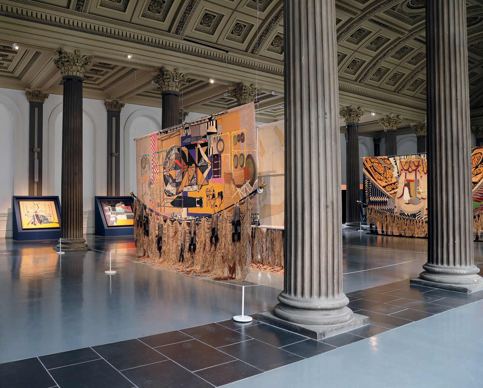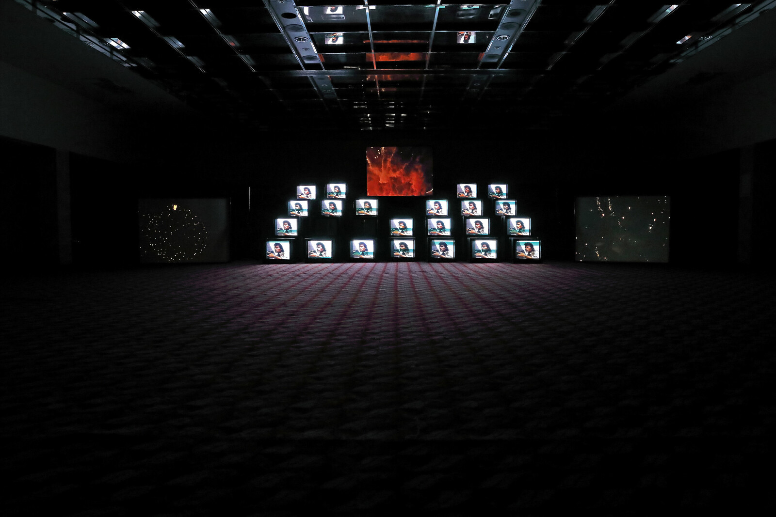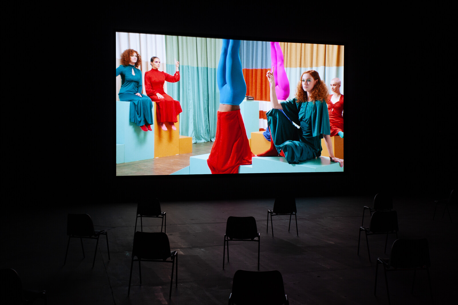 The festival’s core program involves 12 artists exhibiting in venues across the city. Outside Glasgow Sculpture Studios, I lie on an inflatable cushion and watch business as usual: hostile environment (2021) by Alberta Whittle. The film connects the pandemic, the Windrush scandal, and UK immigration policy, drawing attention to the frontline workers who face deportation because their annual salaries don’t meet the financial threshold required to get a work visa. It’s screened on the side of a van, Whittle tells me, in order to echo the Home Office “Go Home” vans, driven around the UK in 2013 as part of the Conservative government’s “hostile environment policy.”2 Gretchen Bender’s Total Recall (1987) is on show at The Glasgow Royal Concert Hall, a montage of television and film footage played across 24 monitors, and a prescient vision of our current domination by the media matrix. At Barrowland Ballroom, Duncan Campbell’s o Joan, no… (2006) is screened beneath the mirror balls, a 12-minute film of a woman grunting and sighing accompanied by flashes of light.
