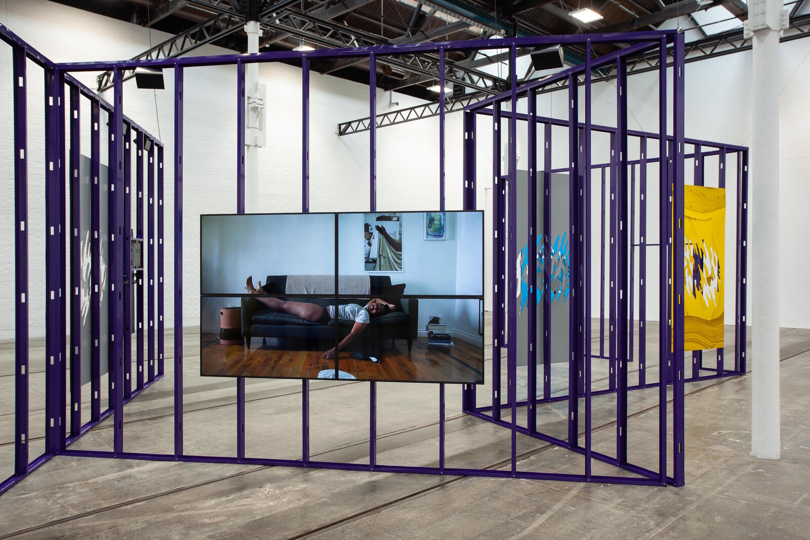 Despite the quality of much of the work, at times the heavy presence of film can feel like an endurance test for a niche type of masochist; it also has unfortunate echoes of a year spent heavily reliant on screens. This made Paul Maheke’s live performance at SWG3 on the opening night all the more moving. Maheke walked into the hall in satin shorts and knee pads, and began dancing on his toes like a nervous boxer. As he jabbed and trembled, he seemed to channel the anxiety that has gathered over the past year and shake it out of his system. Running alongside the core content is the larger Around the City Programme (ACP), an array of events and exhibitions staged by artists, galleries, and other organizations. Participants, who must be based in Glasgow, are selected for inclusion by a panel of artists and curators assembled by the festival, and provided with funding of up to £10,000. As in past years, the ACP doubles up as an excellent introduction to the Glasgow scene, from commercial galleries to DIY spaces. At The Modern Institute, Eva Rothschild’s slick, abstract sculptures fit into the category of “lobby ready” art, easily transposed from gallery or art fair to cavernous atrium. The program really shines when it takes viewers out of white cubes and into venues embedded in the life of the city. At the Glasgow Women’s Library, a local institution that exists under the perennial threat of closure, Ingrid Pollard has made an exhibition from the lesbian archive in the library’s holdings. Speakers have been added to bookshelves, through which visitors can listen to the oral histories of women involved in community organizing. The festival’s stand-out exhibition, and also part of the ACP, is at Celine: an artist-run gallery in a top-floor tenement flat in Govanhill, a neighborhood where many of the city’s artists and writers live.