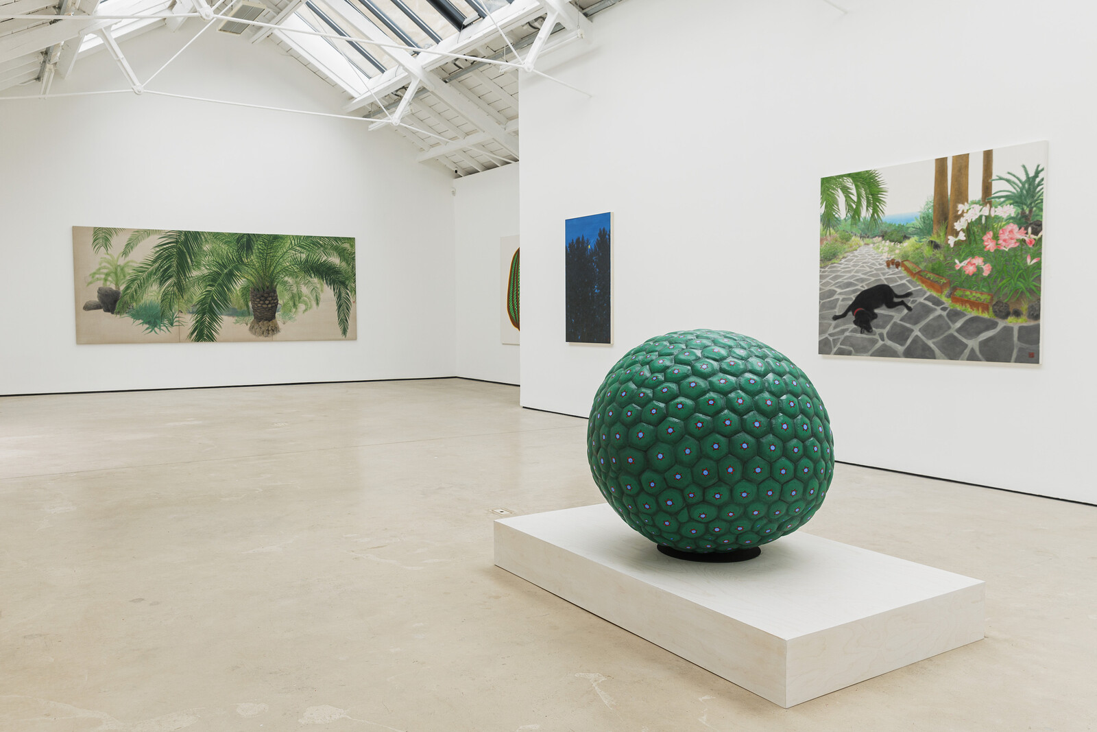 This year’s Glasgow International didn’t have a title concept, a decision that seems sensible and suggests confidence, the curators feeling no need to shore up the works with one big point. It also allows subtler themes and differences to suggest themselves. At the Modern Institute, Kim Bohie’s paintings of twilights and sea views could hardly be less like Wilkes’ work—Bohie’s paintings take being pleasant to an extreme—but they share a quality of sincerity and a sense of compulsion toward the subject. Bohie’s rich paintings (of leafy branches, black dogs, amaryllises, volcanic rocks, and low yellow moons) would be at home in an art collector’s vault, but I could equally see them in reproduction in a hospice or a waiting room, places where an artwork has a different kind of value, one that is more immediate. Bohie references the sansuhwa Korean landscape tradition, drawing on ideas of naturalism and communion—and also John Constable, an artist known for his resolution to paint things that he loved and wanted to spend time with, like his wife, or his father’s vegetable plot, or a splendid tree.