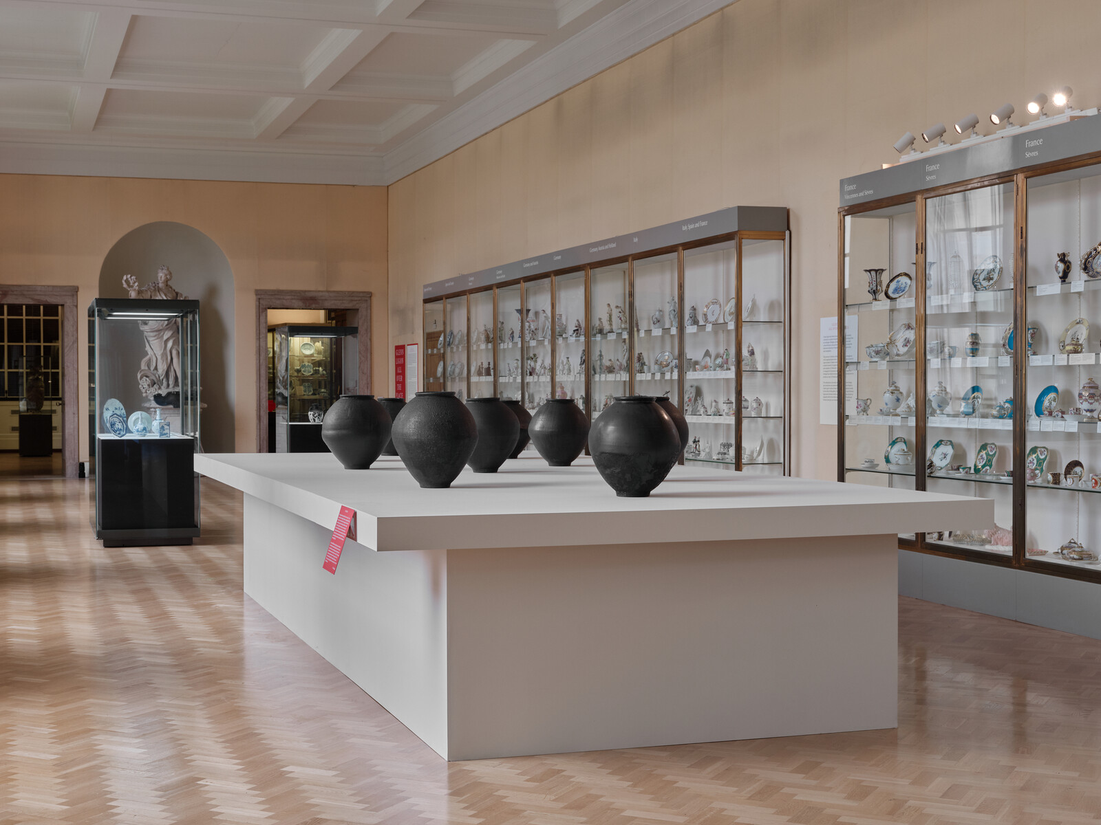 Ligon’s multimedia work often interrogates race, even if it cannot be reduced to that subject, and his subtle interventions into the museum’s collection are consistent with his multilayered practice. On the ground floor, Ligon has selected objects from the museum’s collection of porcelain from Europe and Japan, showing them alongside his take on Korean Moon jars, painted a blackish hue instead of the traditional white. On the floor above, Ligon has rehung flower paintings from the collection of seventeenth- and eighteenth-century Dutch still lifes, rearranging them to form new connections. Written on red cards instead of the standard white, Ligon’s annotative texts are casual in tone, feeling as personal as diary entries.