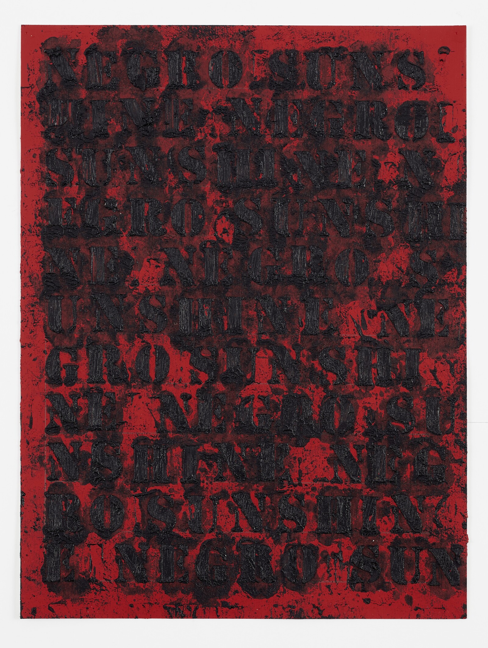 The series of works on paper titled “Study for Negro Sunshine (Red)” (2018–ongoing) punctuates the mostly representational paintings from the museum’s permanent collection in three galleries on the top floor. Ligon has been working with this phrase “negro sunshine” for over two decades, having first come upon it in Gertrude Stein’s story “Melanctha,” part of Three Lives (1909). The phrase is used in a description of a Black female character, Rose Johnson, who, like many of Stein’s Black characters in the novella, is flattened by the tendency to “trade in racial stereotypes.”1 Returning to this phrase over and over again through the years, writing it in stenciled black letters overlaid by black oil stick, Ligon renders it almost illegible, as though to strip it of its potency through repetition: a muted homage to Stein’s radical style, embedded in critique.