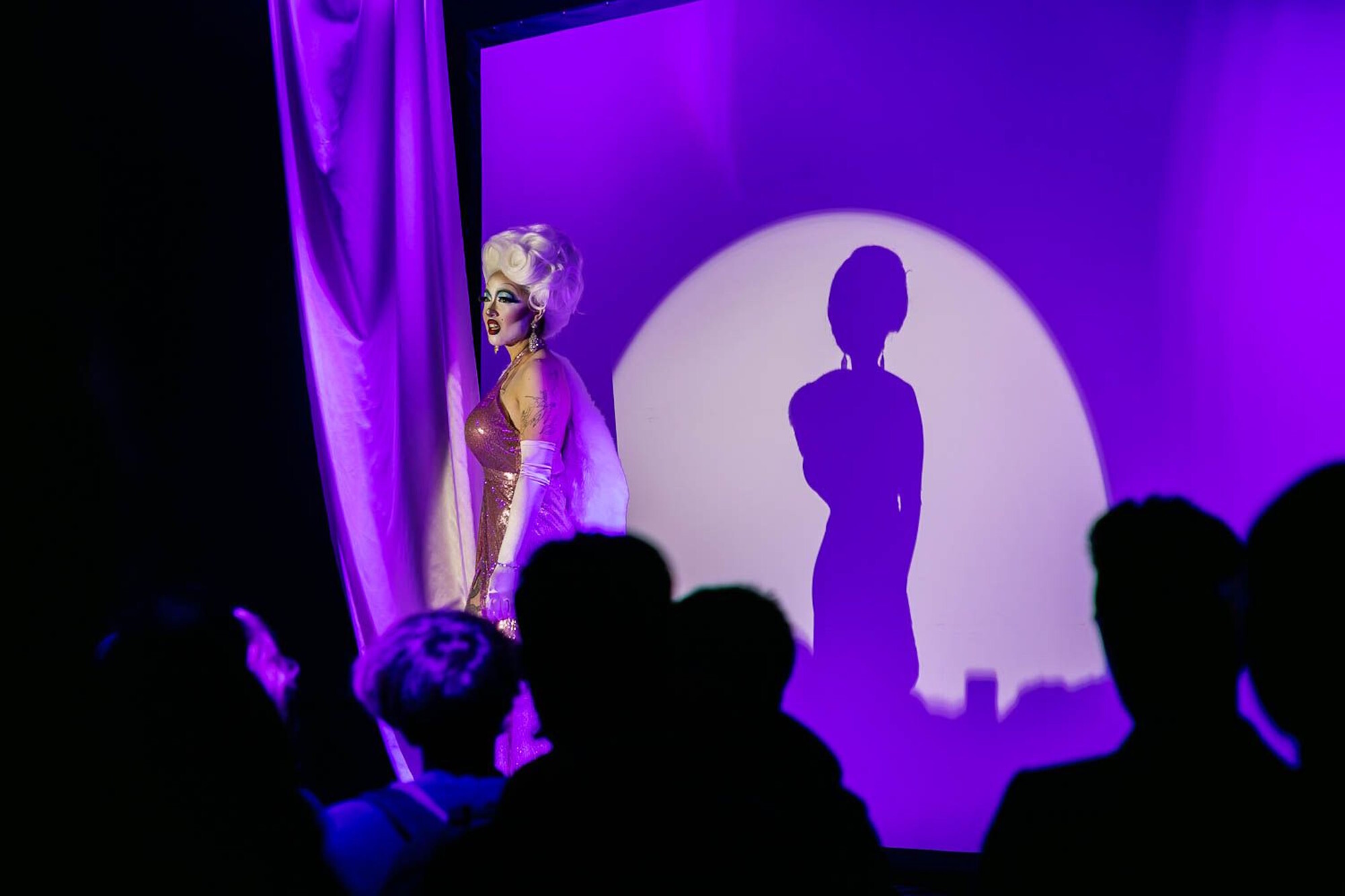 Sin dons gender as prosthesis. An homage to an expansive history of masculine/feminine drag performance and genderfucking, Sin’s costumery is replete with breast and buttocks inserts, a sumptuous wig, makeup painted with vivid artistry and a sweeping gown that glitters. Sin’s aesthetic is an evocative, mesmeric cocktail, that weaves with satire and expertise the sensory swagger of cabaret, buzz of burlesque, vintage Hollywood glamor—all with a dash of Jessica Rabbit.