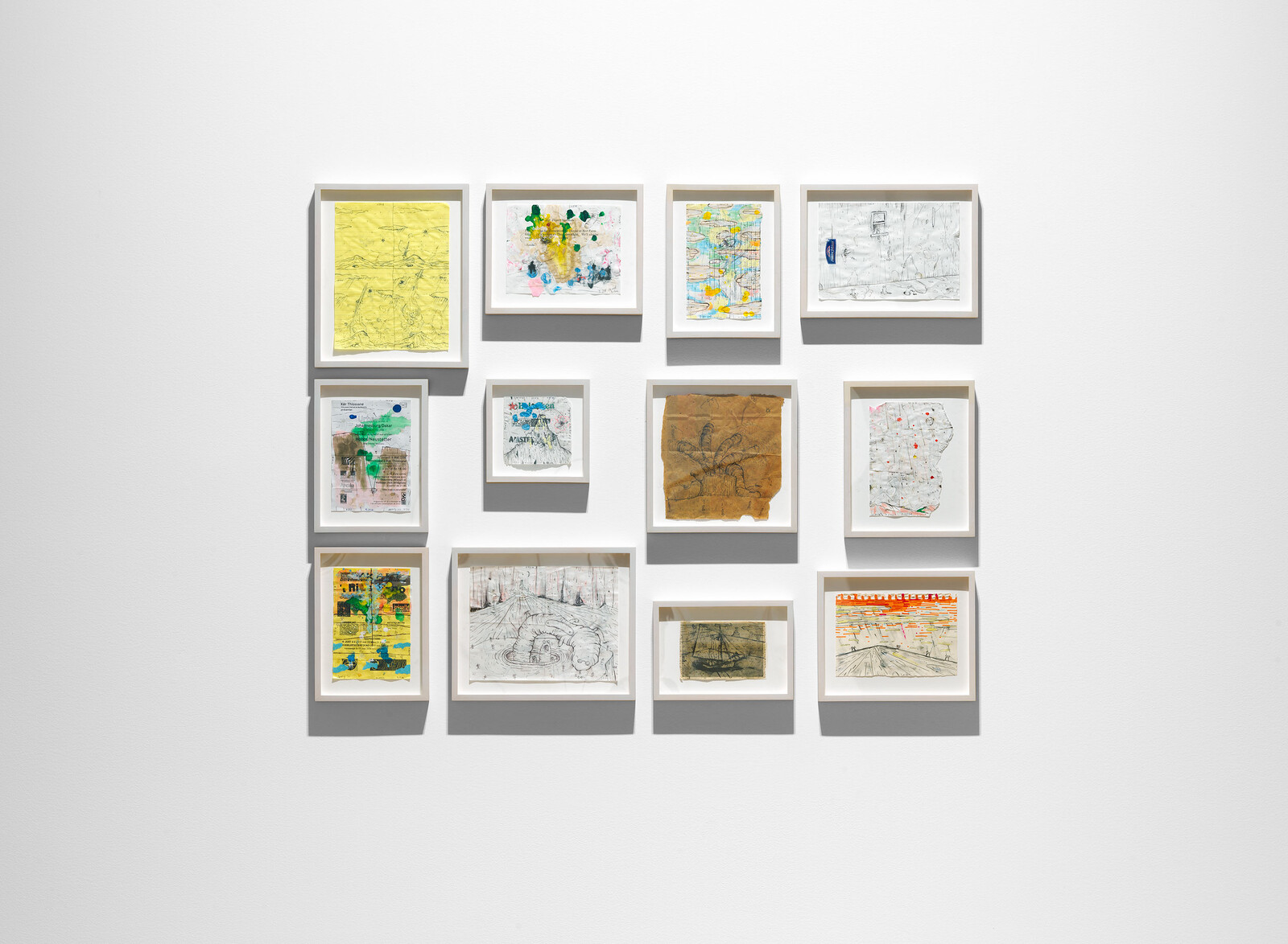 The pairing of these two artists—both obsessed by risky, raw encounters with the built environment, here along opposite axes—shifts the monumentality of Matta-Clark’s urban cut-ups towards the crawlspaces Pope.L is wont to inhabit. Vice versa, Pope.L’s pairing with Matta-Clark opens onto the machinic underbelly of his practice. Much of Pope.L’s oeuvre—particularly his well-known, crawl-based performance works that take him on hands and knees across New York City—play with the visceral embodiment of lack and abjection to trace the deprivations of American life. Others focus on salvaged materials gathered from the street or amassed over time: a tendency echoed here in the “Failure Drawings” made between 2004 and ’06 and sketched directly onto found ephemera, many centering worms and earthbound crevices. Voids are central to Pope.L’s work—so much that the artist penned a “Hole Theory,” an artist book from 2002, on their constitutive importance to his practice. Yet here, with body absent, “Impossible Failures” centers the machine as metabolizer of lack—chewing up the void and spitting it back out in a swarm of dust.