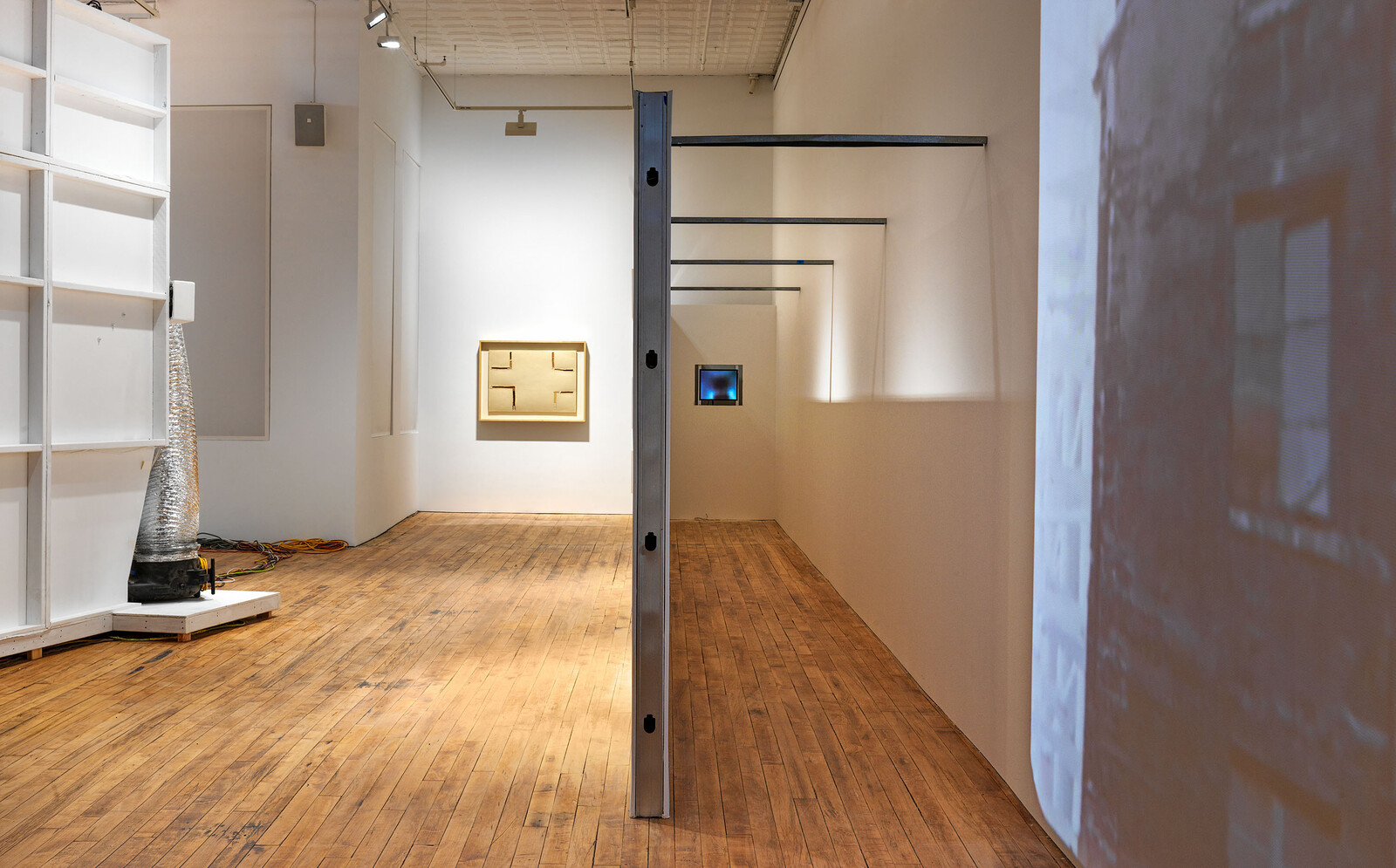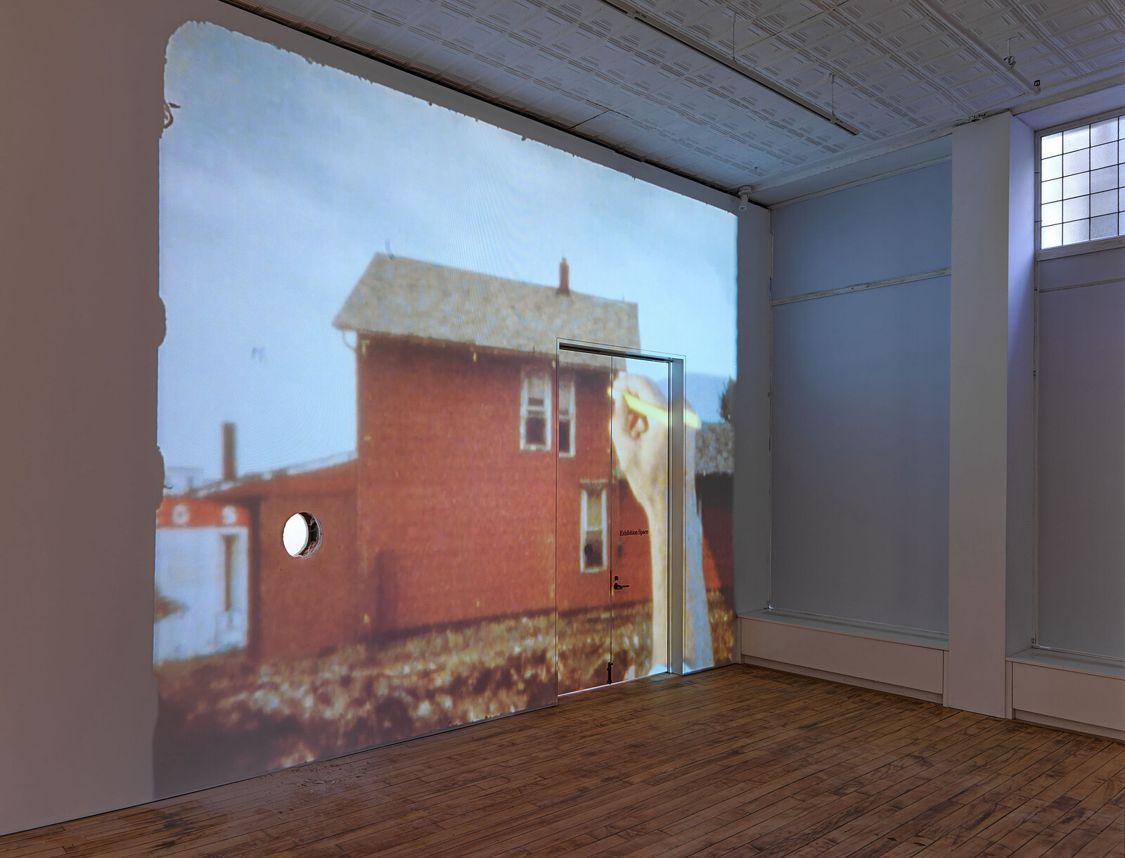 Gordon Matta-Clark’s film Bingo X Ninths (1974), which features a precise dismantling of all but the core of an abandoned house, has been projected at large scale along the first wall of 52 Walker. The door to the exhibition space intersects the projection, such that gallery visitors irrupt onto the image as they enter and exit. A perfectly circular hole, cut straight through the same gallery wall, also interferes with the clean transmission of the film. A layer of dust from this incision lines the gallery floor.