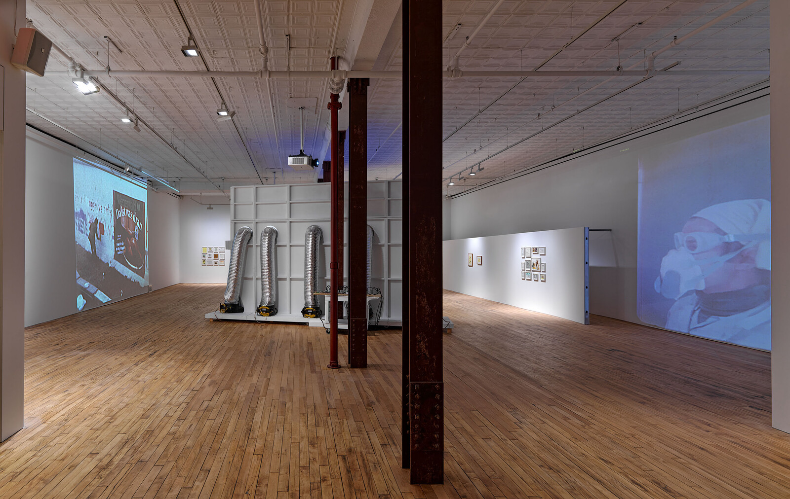 In its configuration here, projected along the right-angle of two adjacent walls in 52 Walker’s space, Conical Intersect appears to slightly distort and elongate the growing architectural hole that is the focal point of Matta-Clark’s video. Opening its maw around the viewer, this voided incision becomes elliptical—tunnel, portal. A video by Pope.L is installed directly left, set at the end of a narrow makeshift corridor. In the center of the gallery, Vigilance—whirring loudly and connected to bundles of wires, its ducts shaking from the pressure of rapid airflow—retains the appearance of a self-sustaining system, even if its warning sign seems to promise imminent implosion.
