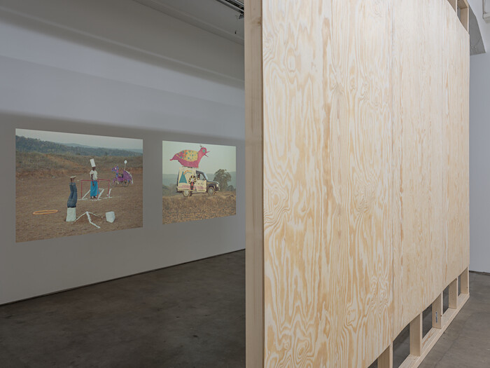 Mercury, and its material properties, is also the inspiration for the title of the film PAARA, made in collaboration with Oslo-based artist Jason Havneraas, here presented as a double projection behind a plywood partition. According to the artist, the title plays both on the Hindi word for mercury, paraa, as well as two confluent Sanskrit catergories “Para Vidya,” transcendental knowledge “and “Apara Vidya,” material knowledge.