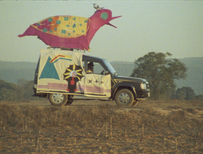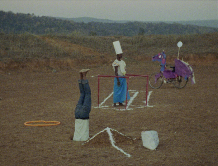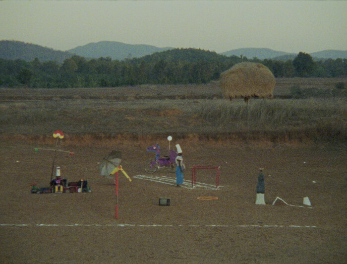 The film’s narration explores the memories of a 90-year-old magician. “It was a grand day for a grand narrative. A space necessarily opened up with 360 degrees of possibility,” chants the narrator, as performers wearing colorful, pointed hats and geometric Dada-like costumes position themselves in various constellations along white stage markings, outlined on the ground. They hold and move various props, but the relationship between the bodies and performed rituals is elusive; the rules of the game remain unknown to us. In the gap between the narrator’s words and the performed magic rituals, objects both exist in time and carry it forward, always between a moment of stasis and of becoming something else. Just as the magician in the film recollects how he moved a rope to make people believe they were seeing a snake, so objects in Ghosh’s universe freeze momentarily into a specific state to become a part of a composition.