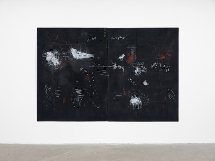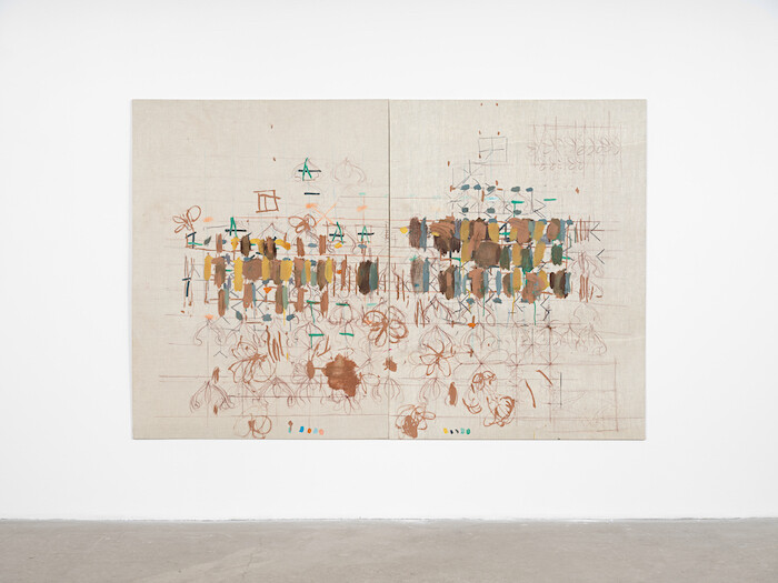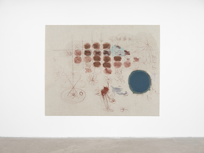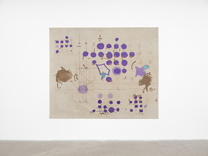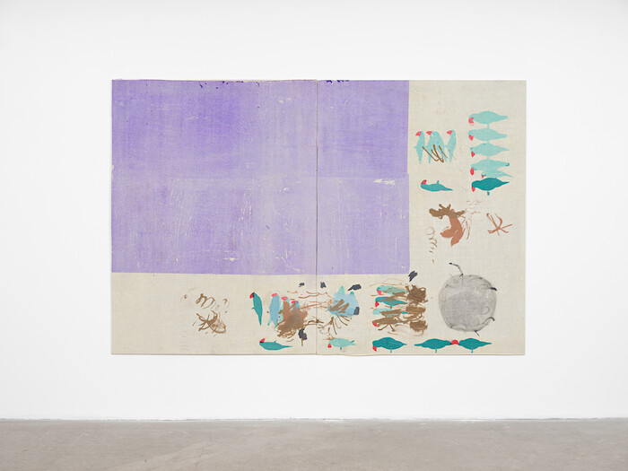 Glycerin is a large painting on plywood, but the circles plotted against a sketched grid are impressions of kite paper—an inexpensive yet lustrously colored paper sold in thin sheets at corner stores throughout India—the color of which Ghosh has transferred to the work’s surface, staining it the same buoyant purple as in Violet. The birds are both symbolic and indexical, figures in the exhibition’s language and also the intimate stains of another surface. In this doubleness, each volume of transferred color represents the impossible ground on which a sign depends for sense.